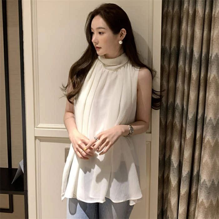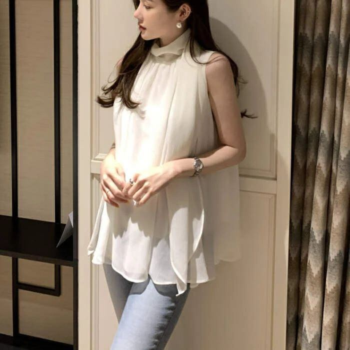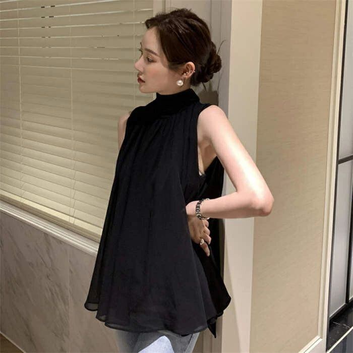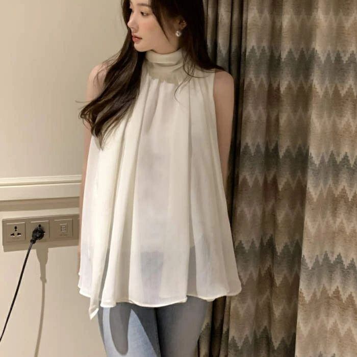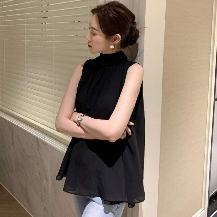 ブラウス レディース ノースリーブ タンクトップ ハイネック 無地 シフォン シャツ フリル シンプル とろみシャツ Aライン 立ち襟 シャツブ