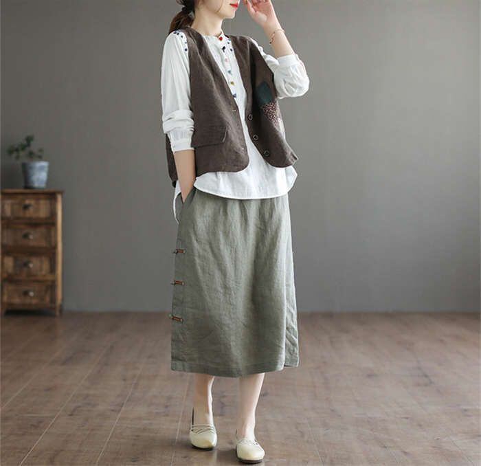 ト無地スカート綿麻混スカートプリーツスカートリネンスカートサロペット