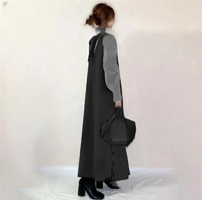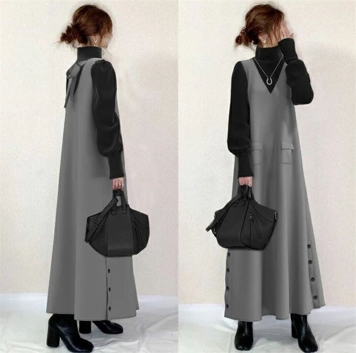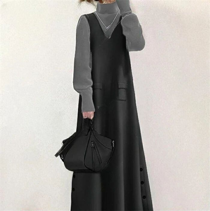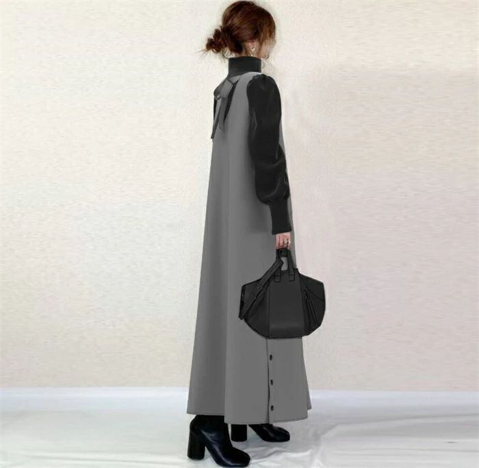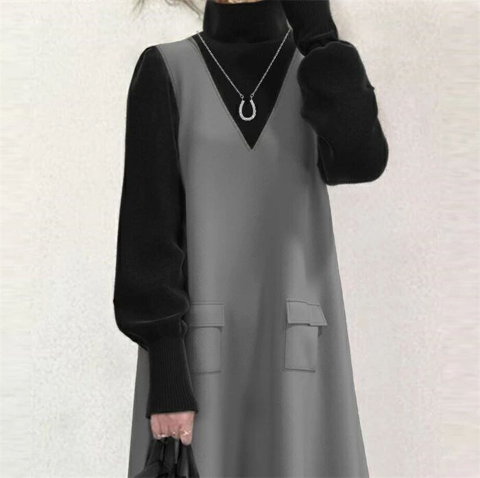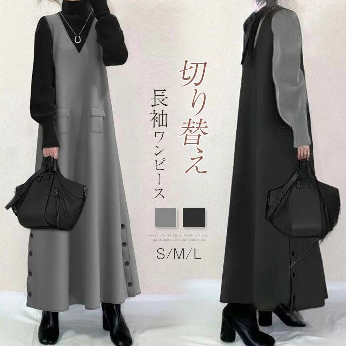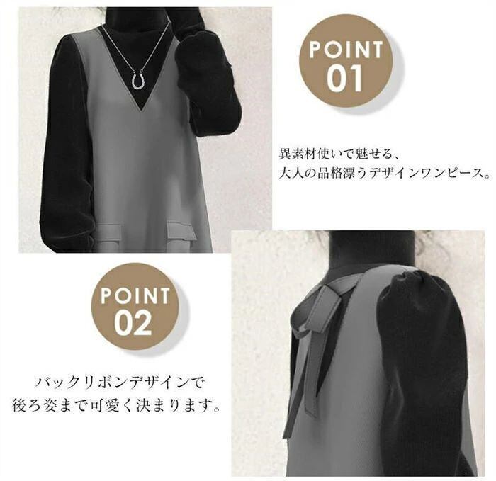 ワンピース 異素材切り替え レディース 秋冬 ロングワンピース 切り替えワンピース 切り替え ロング丈 異素材 長袖 ハイネック Aライン フ