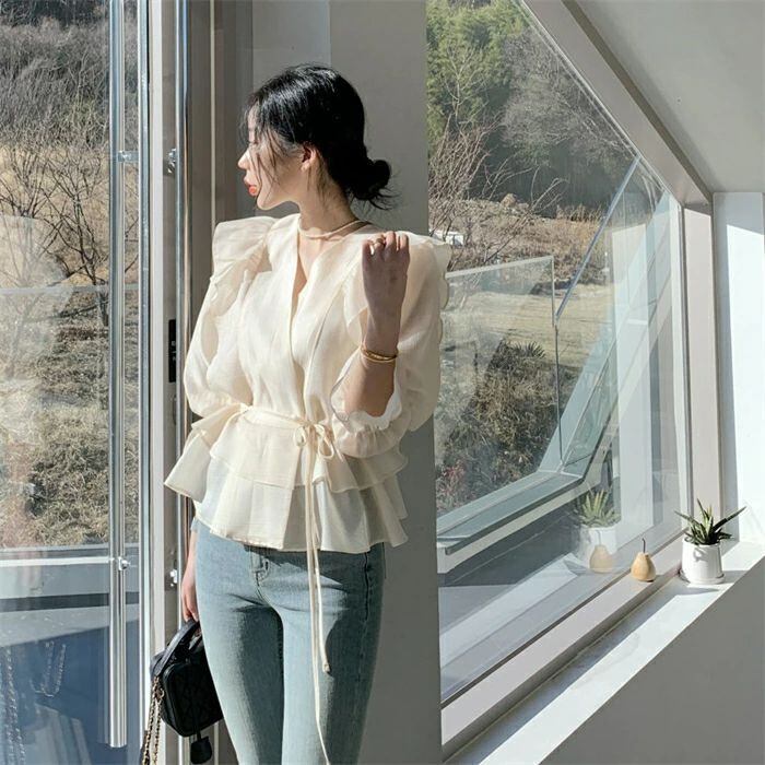 シアシャツブラウス フリルブラウス シャツ ブラウス レディース 春 夏 秋 トップス Vネック 長袖 シアーシャツ パフスリーブ 無地 きれいめ 無地 ウエストリボン付き オケージョン きれいめ オフィス カジュアル 高級感 華奢魅せ 上品 30代 40代 50代 送料無料