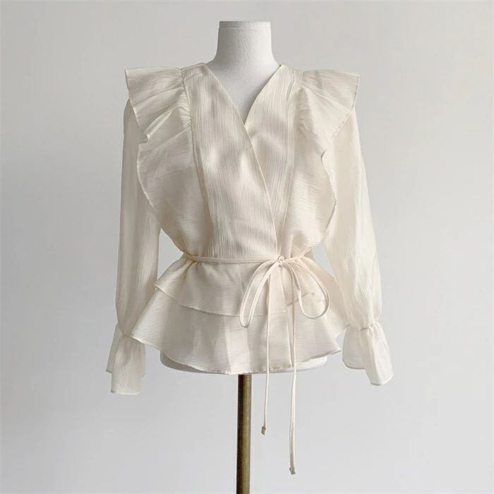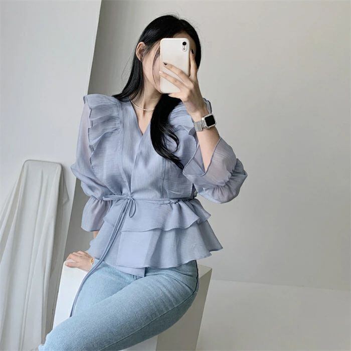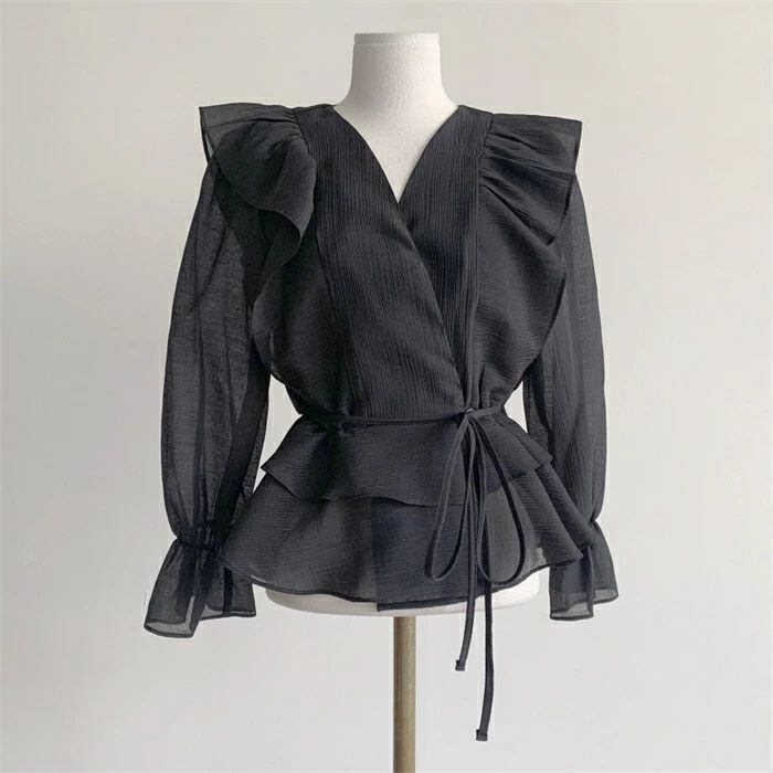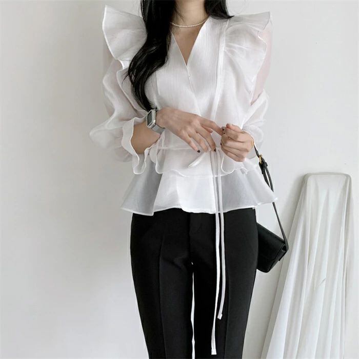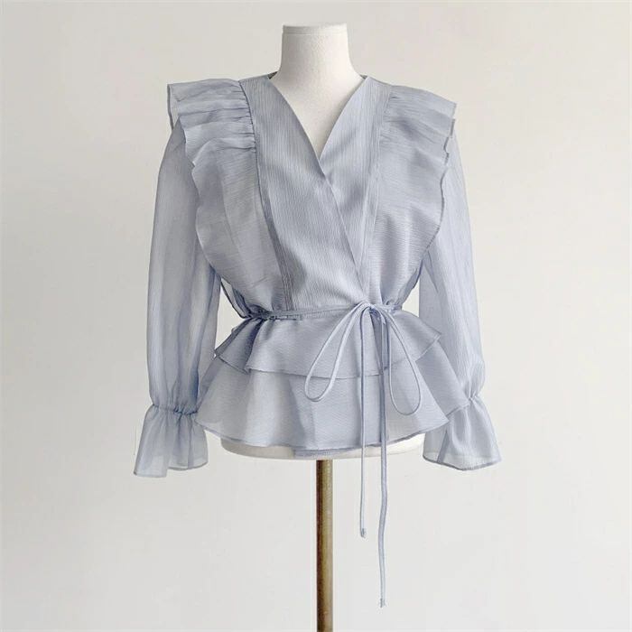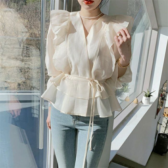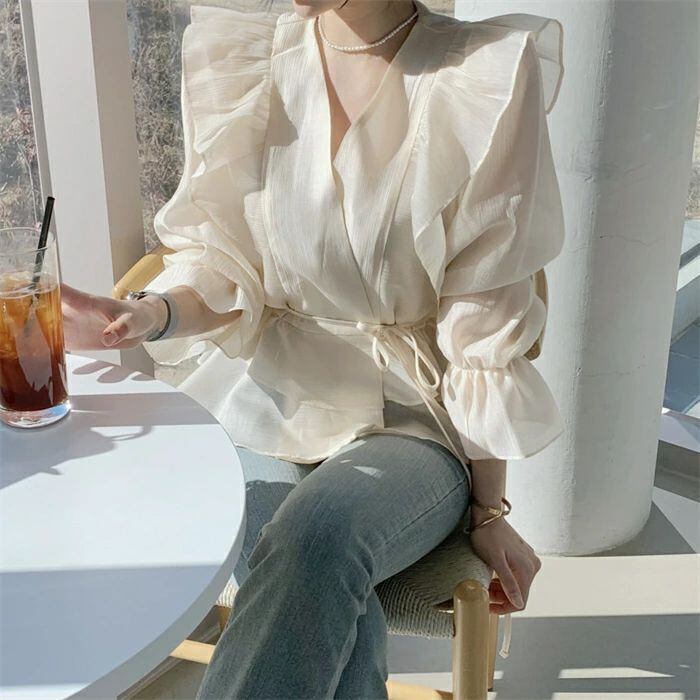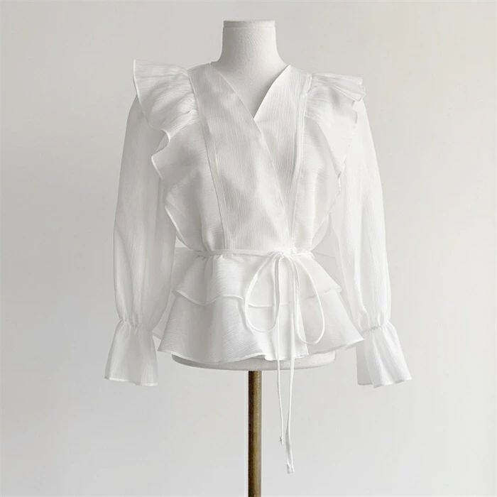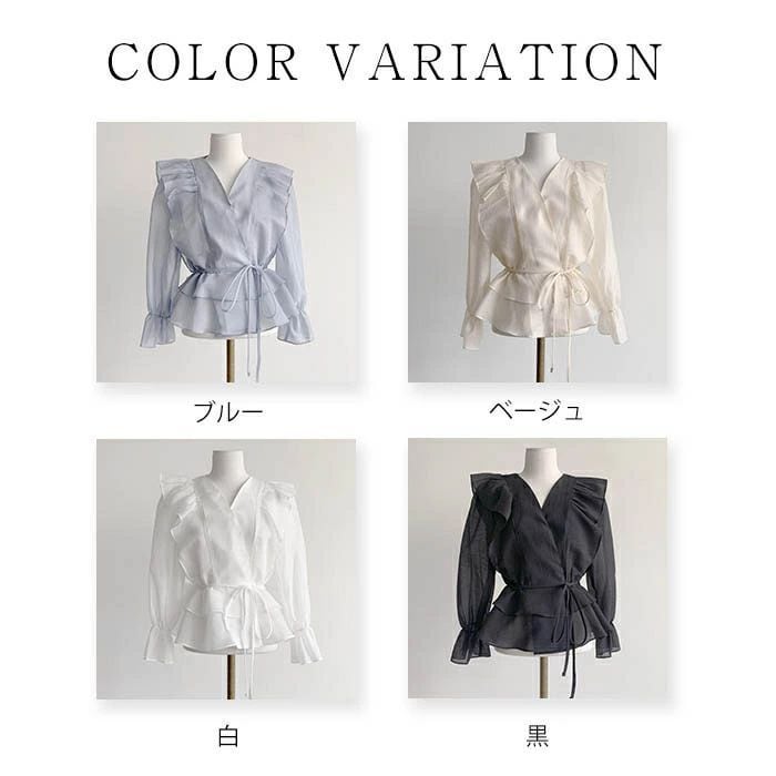 シアシャツブラウス フリルブラウス シャツ ブラウス レディース 春 夏 秋 トップス Vネック 長袖 シアーシャツ パフスリーブ 無地 きれい