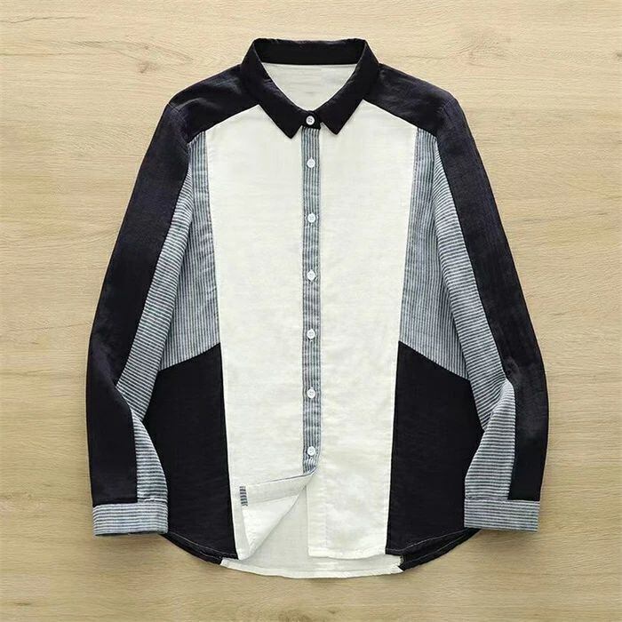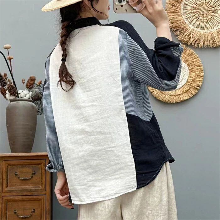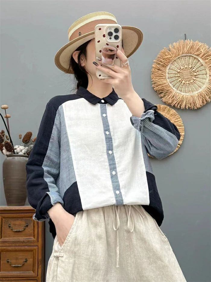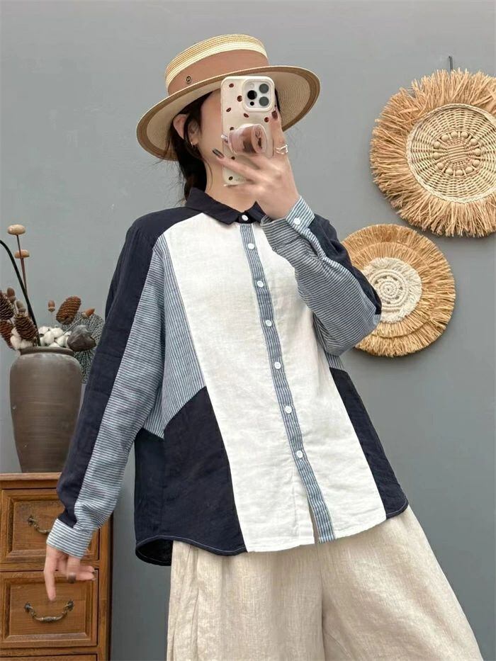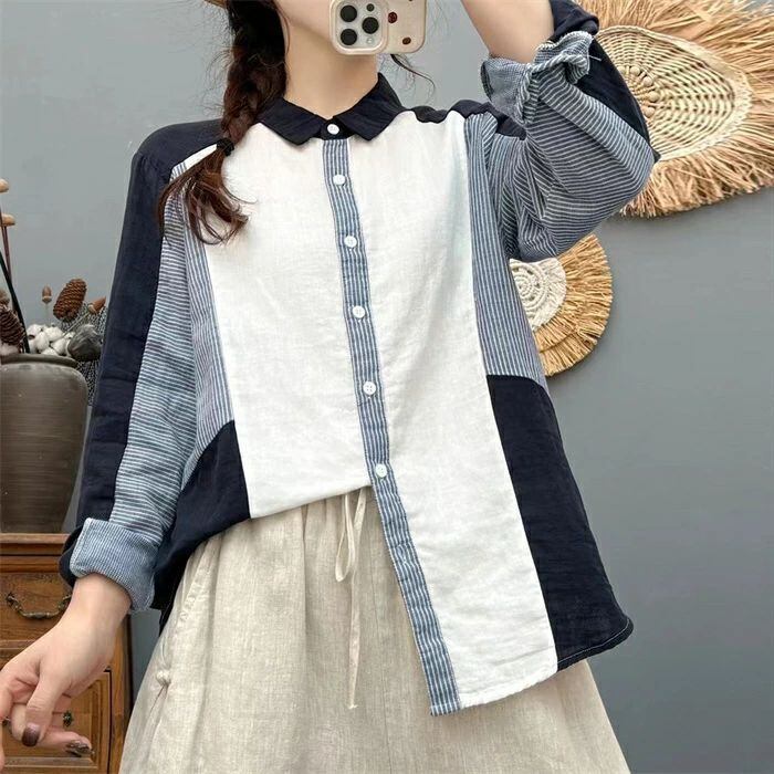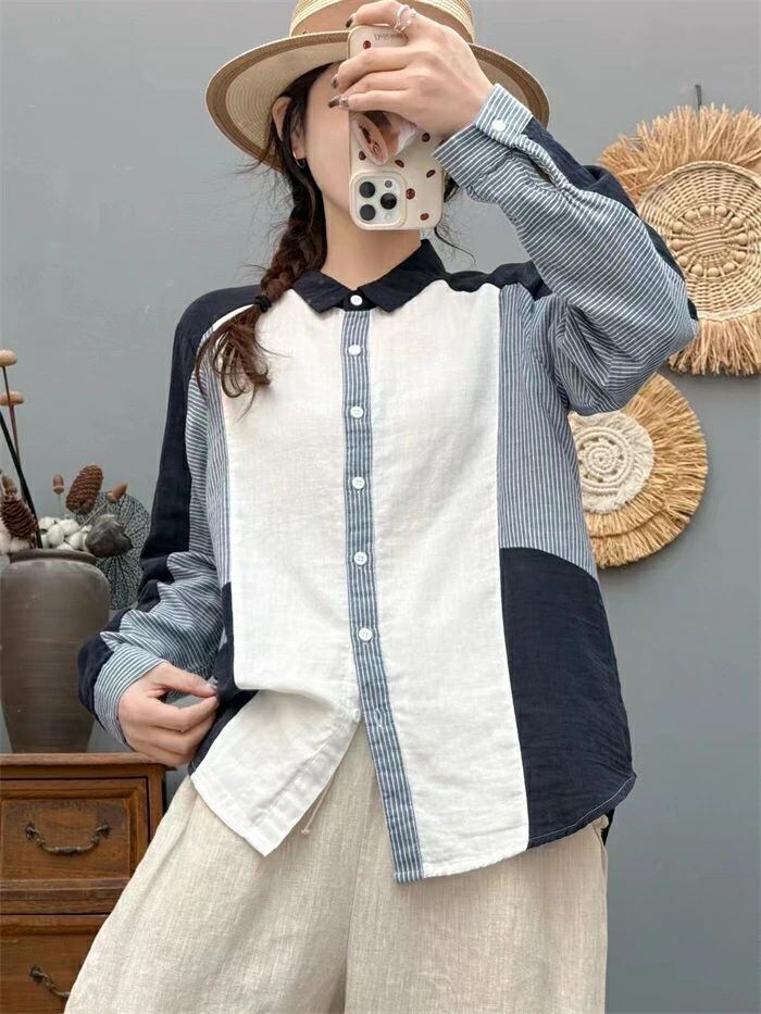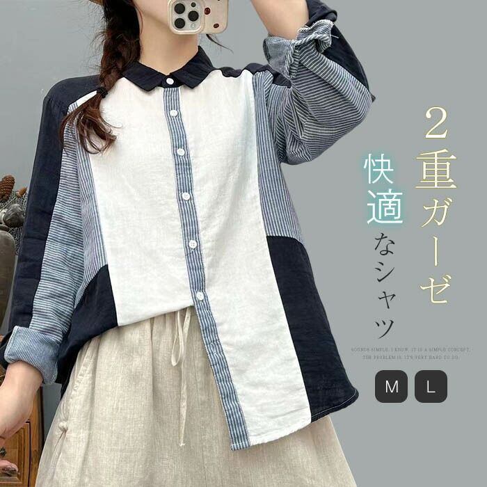 ガーゼシャツ シャツ レディース 春秋 綿ガーゼ 長袖 ブラウス ダブルガーゼシャツ シャツブラウス ストライプ柄 折襟 ガーゼ コットン 綿