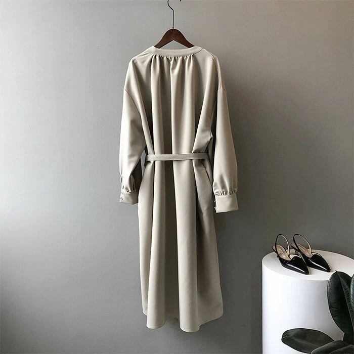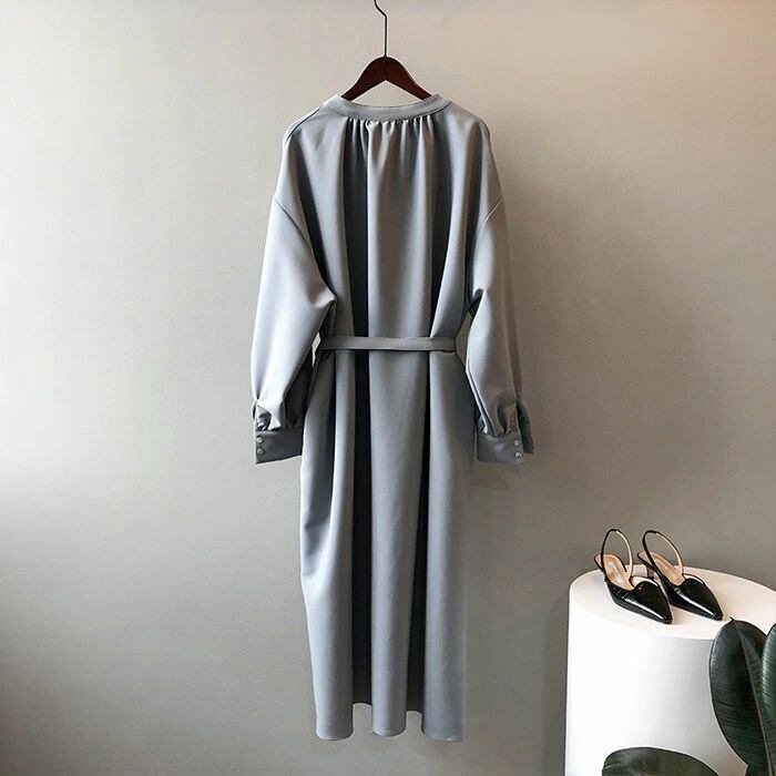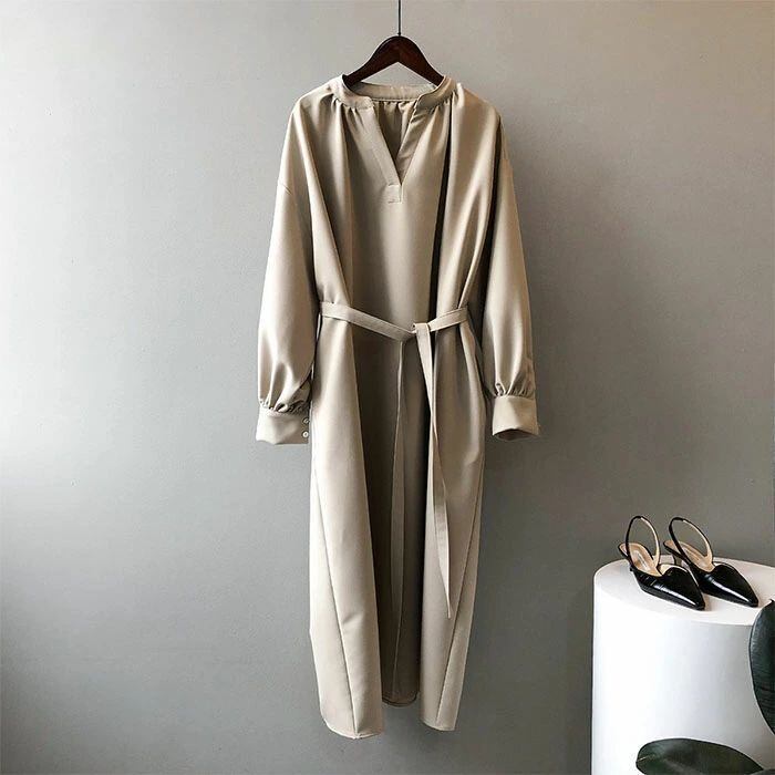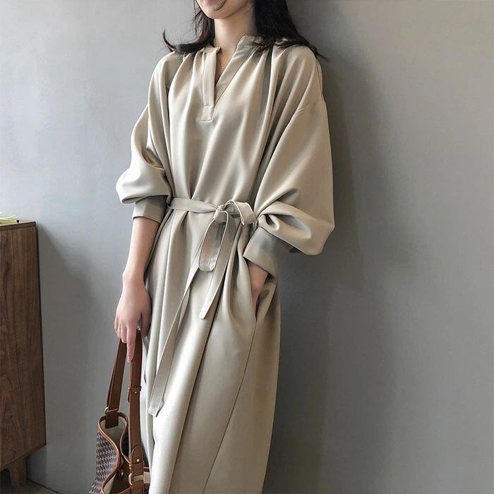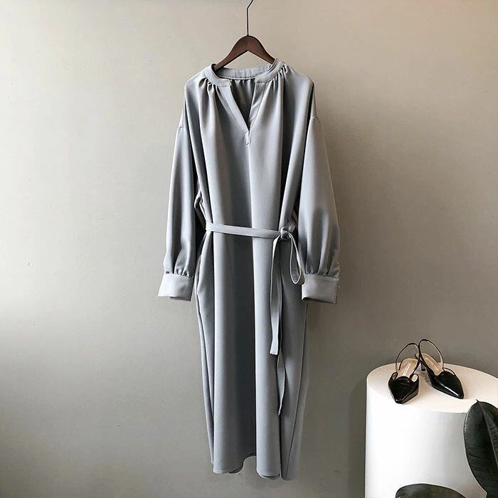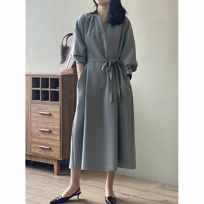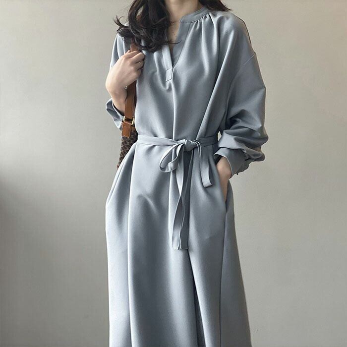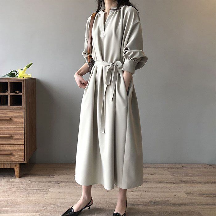 ロングワンピース 長袖 ワンピース ロングワンピース Vネック レディース 春秋 マキシ丈 ロング丈 無地 リボン付き Aライン ゆったり 綺麗