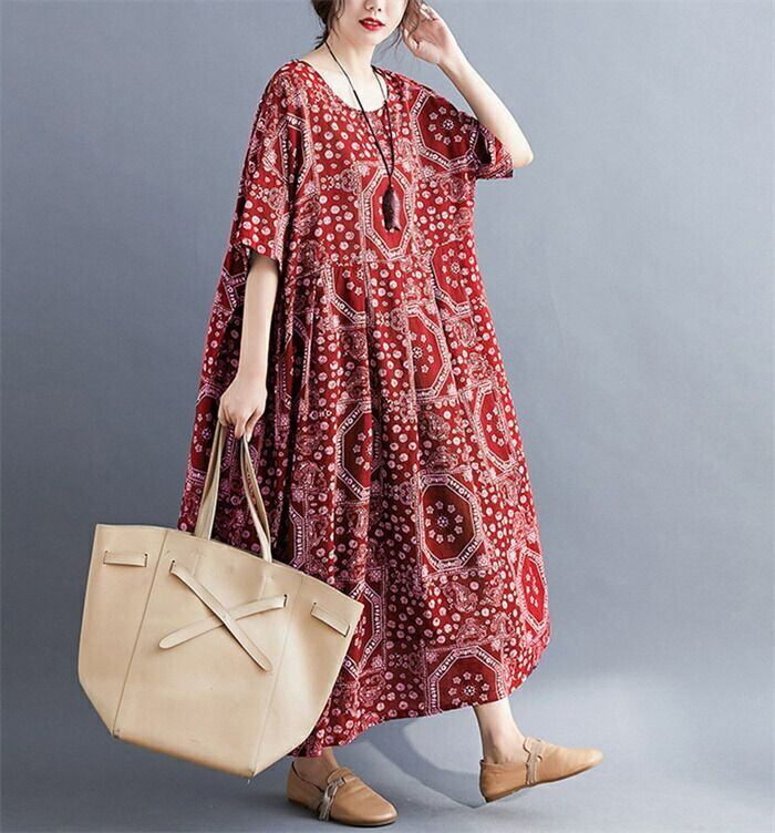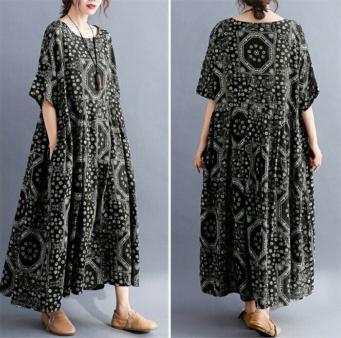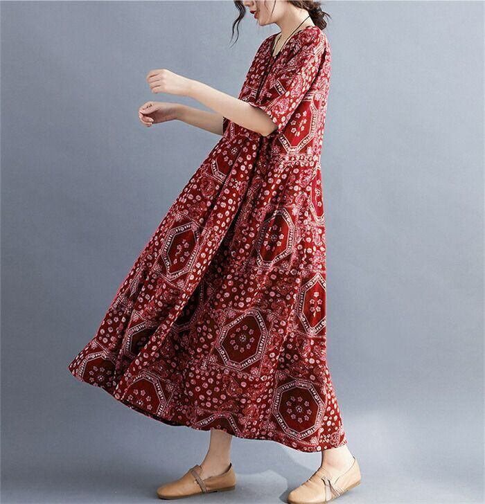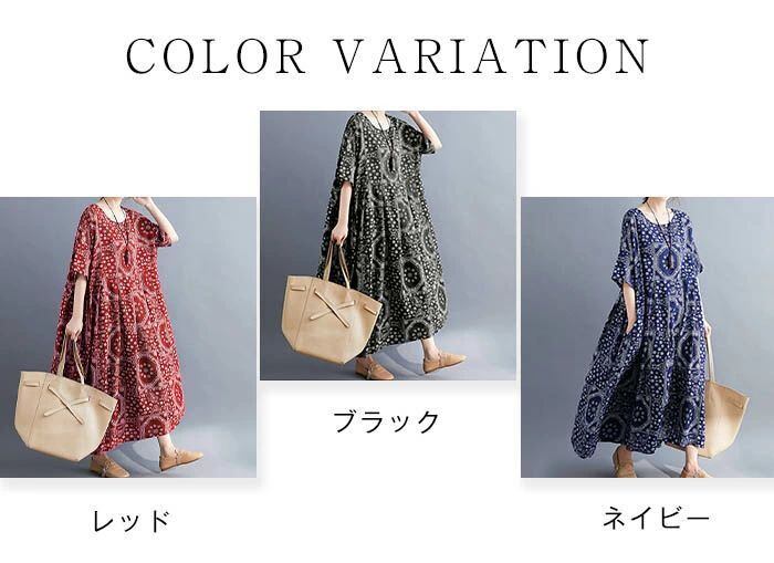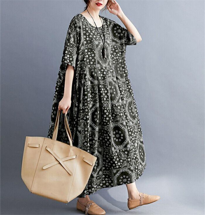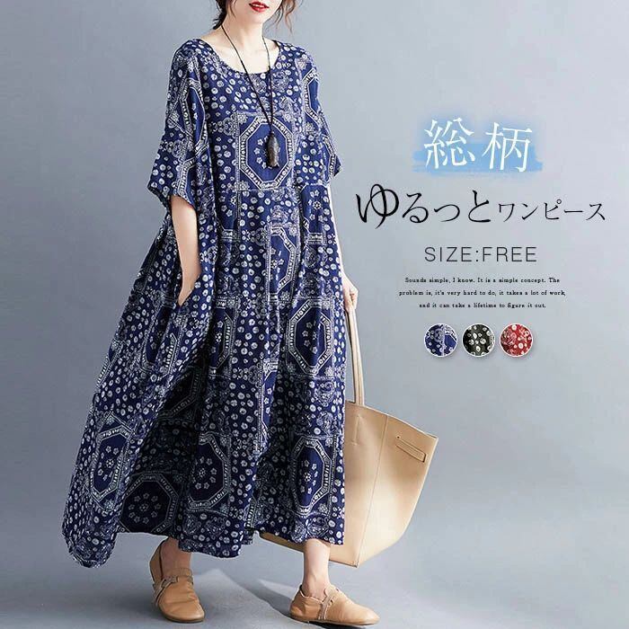 ワンピース マキシワンピース レディース 夏 マキシ ワンピ ロングワンピース 総柄 半袖 大きいサイズ ロング丈 Aライン リゾート クルーネック ロングワンピ フレア ゆったり 体型カバー エスニック カジュアル シンプル レトロ 30代 40代 50代 送料無料