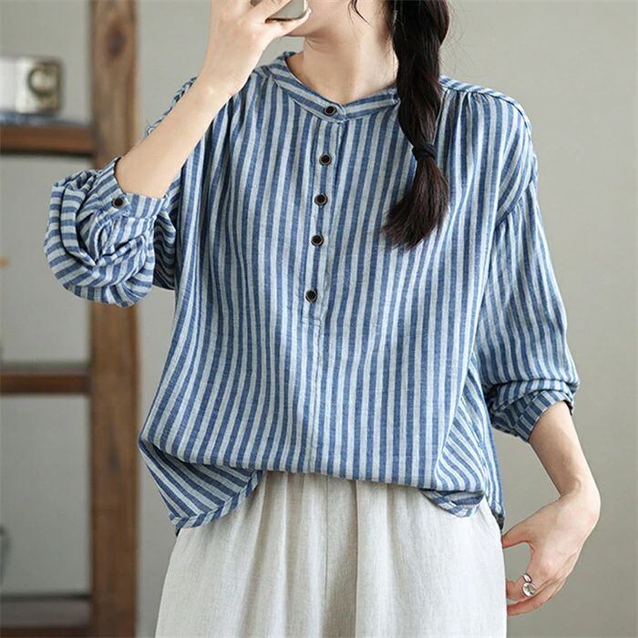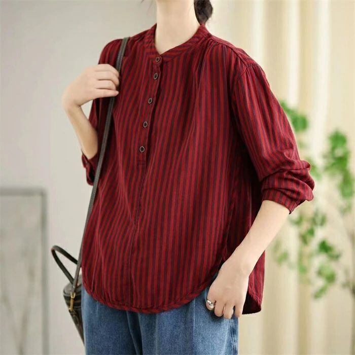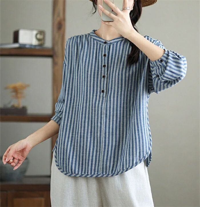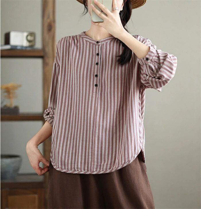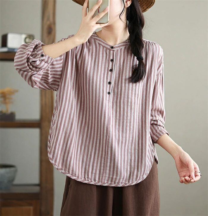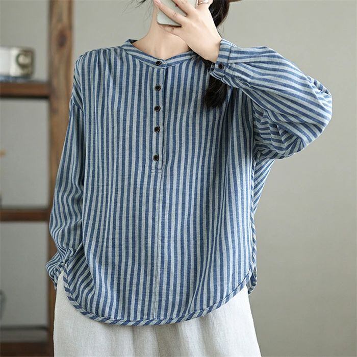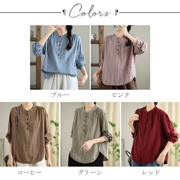 シャツ ガーゼシャツ ストライプシャツ レディース 春秋 シャツブラウス ガーゼ ストライプ柄 長袖 綿麻風 立ち襟 オフィス トップス プルオーバー ゆったり 体型カバー ナチュラル おしゃれ 着回し 柔らかい 通勤OL 30代 40代 50代