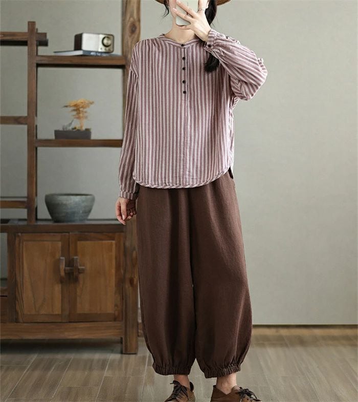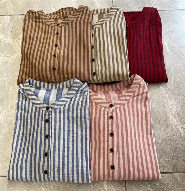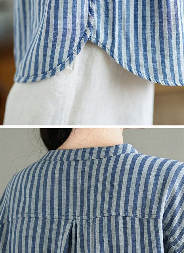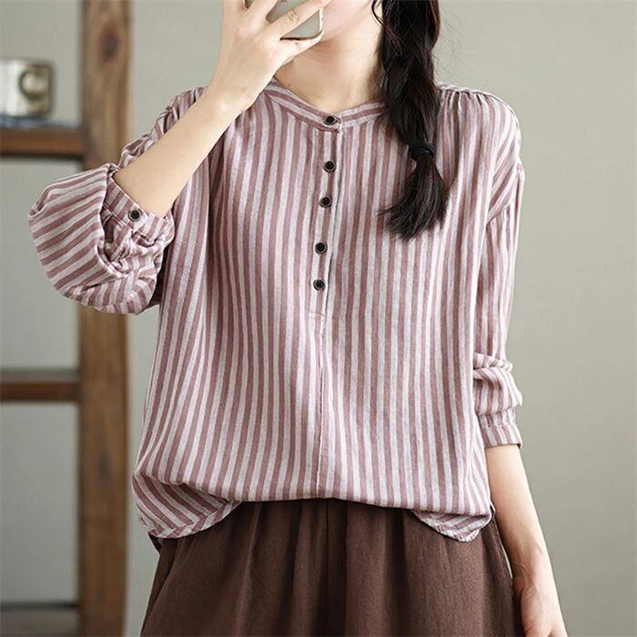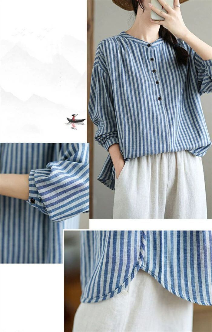 シャツ ガーゼシャツ ストライプシャツ レディース 春秋 シャツブラウス ガーゼ ストライプ柄 長袖 綿麻風 立ち襟 オフィス トップス プルオーバー ゆったり 体型カバー ナチュラル おしゃれ 着回し 柔らかい 通勤OL 30代 40代 50代