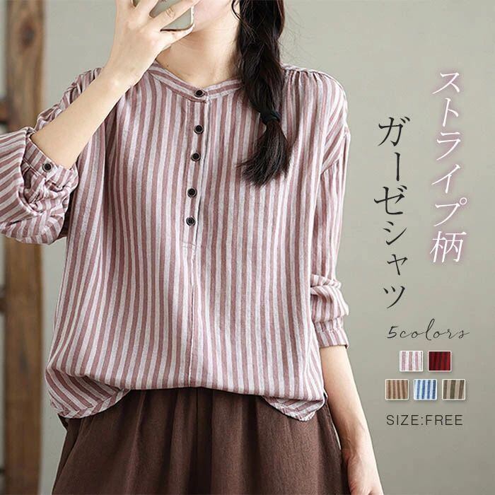 シャツ ガーゼシャツ ストライプシャツ レディース 春秋 シャツブラウス ガーゼ ストライプ柄 長袖 綿麻風 立ち襟 オフィス トップス プル