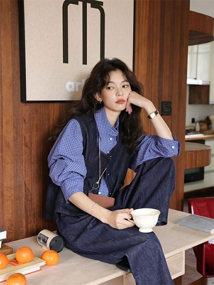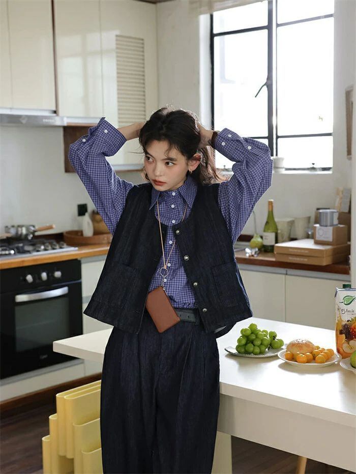 セットアップ レディース 秋冬 3点セット デニム ベスト 前開き 羽織 シャツ 長袖 トップス 折襟 チェック柄 パンツ ボトムス ワイドパンツ