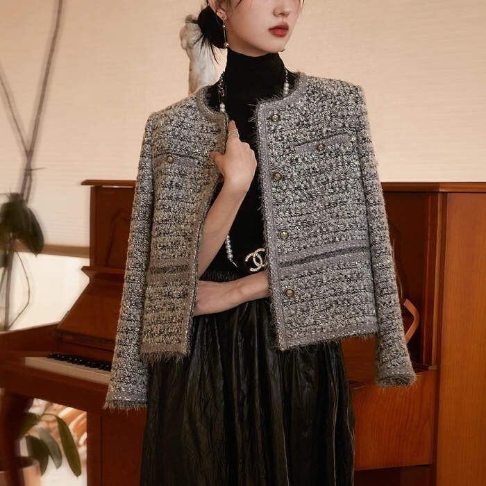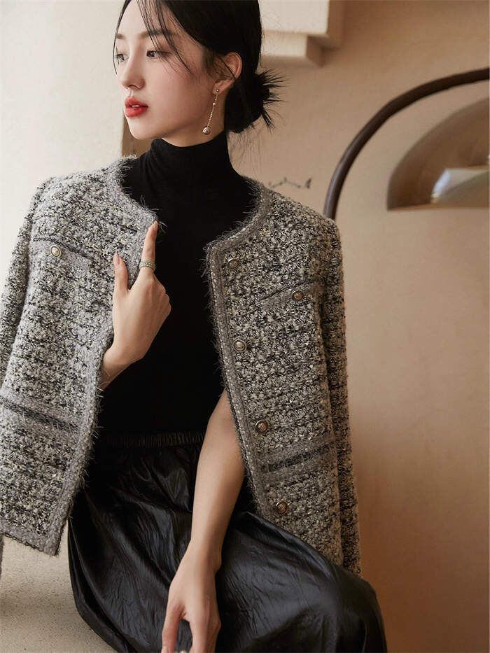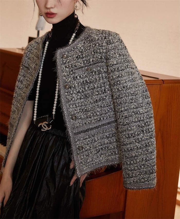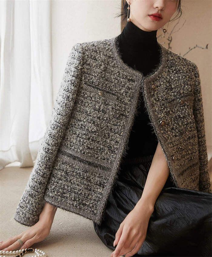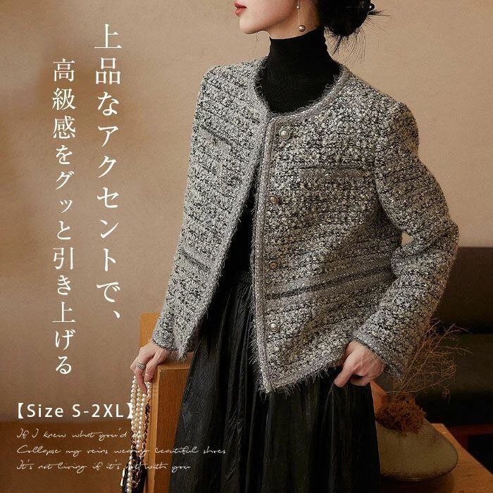 ツイード ジャケット レディース ノーカラー ジャケット 春 秋 冬 長袖 アウター 無地 トップス フォーマル 羽織り ママスーツ おしゃれ シ