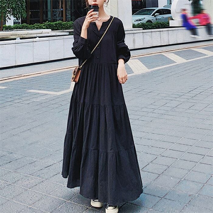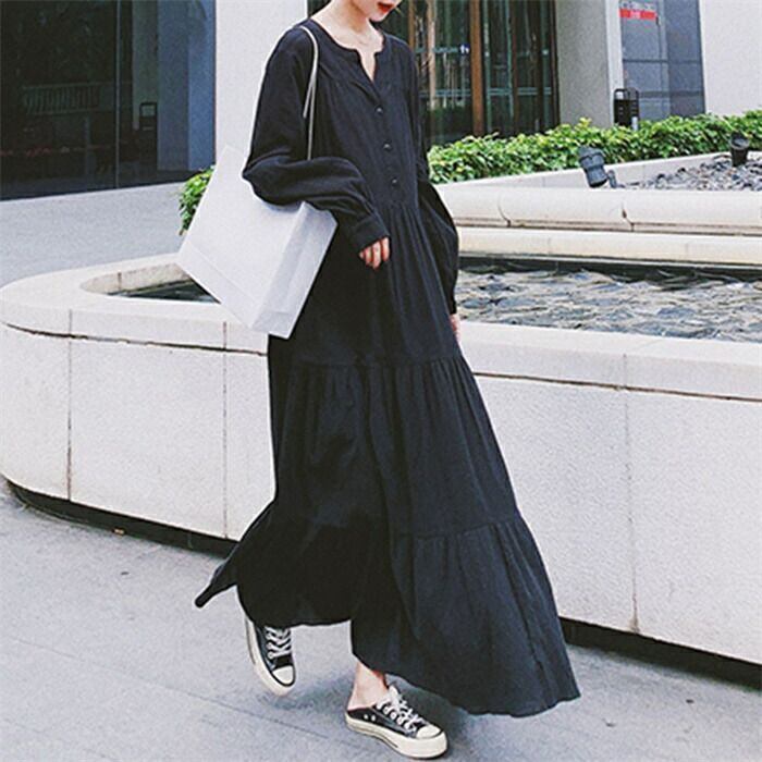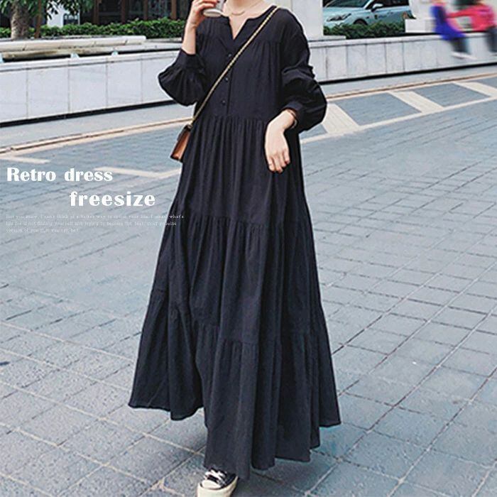 ワンピース ティアード レディース ロングワンピース ボリューム袖 長袖 ティアードワンピース ワンピ 黒 バルーン袖 ロング丈 無地 Aライン マキシ フレア ゆったり 体型カバー 着?せ カジュアル シンプル きれいめ フェミニン 可愛い 通勤 通学 お出かけ ブラック