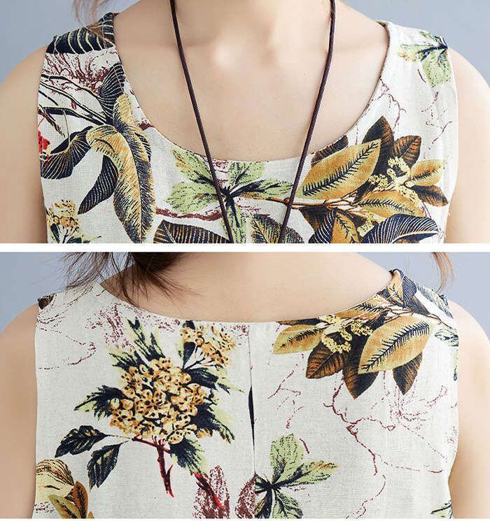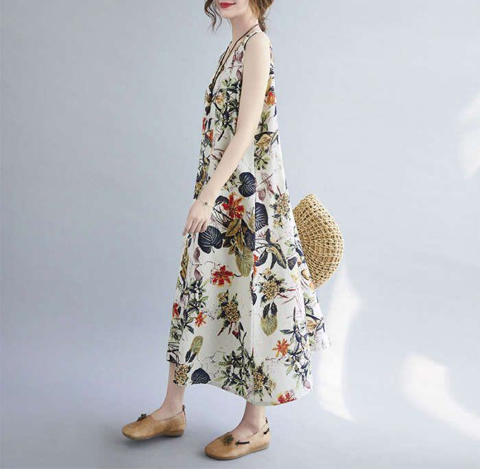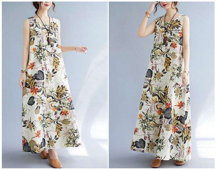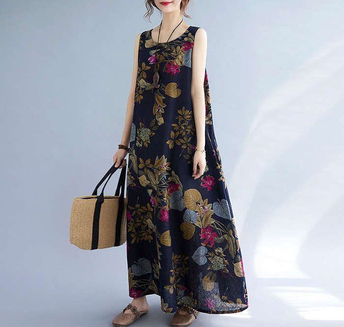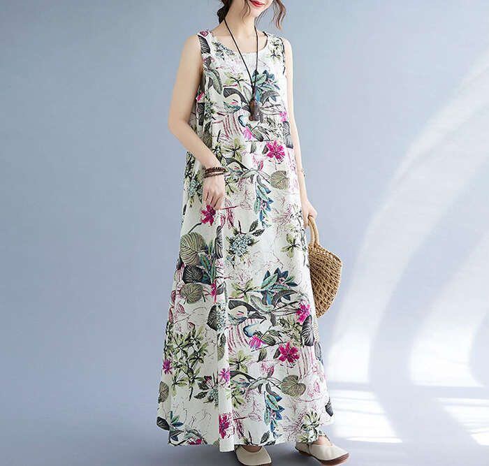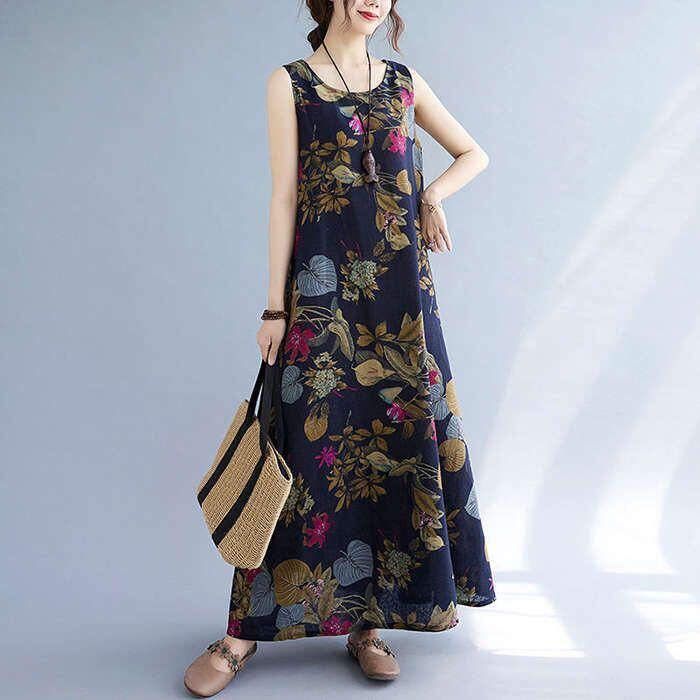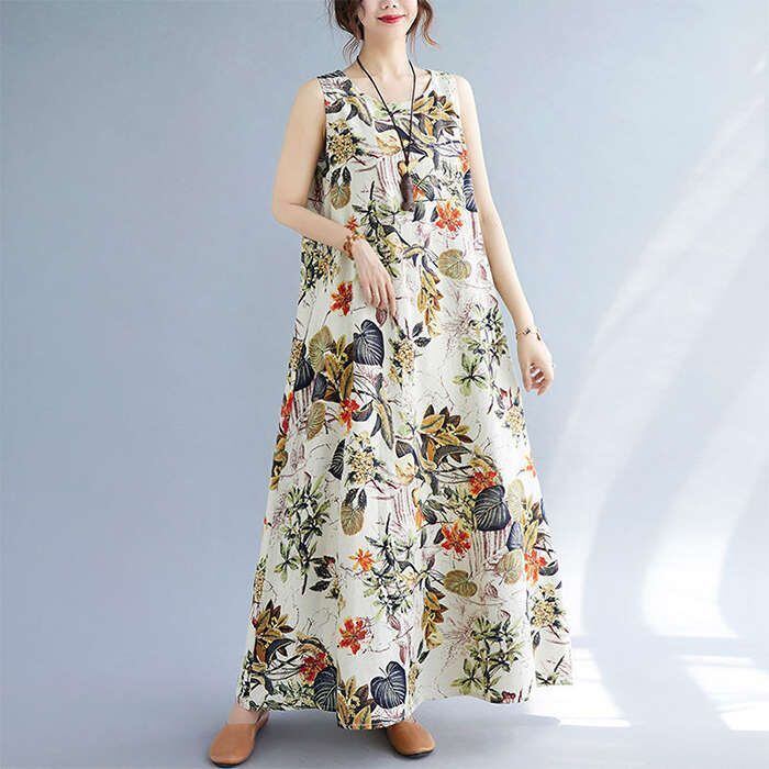 マキシワンピース ワンピース ロングワンピ ノースリーブワンピース 綿麻 リネン レディース 花柄 ロングワンピ チュニック マキシ丈 体型
