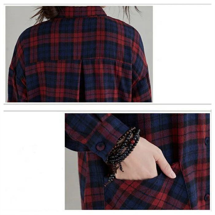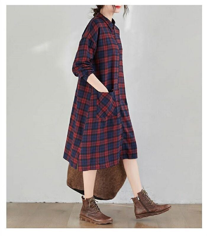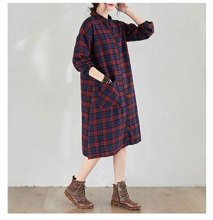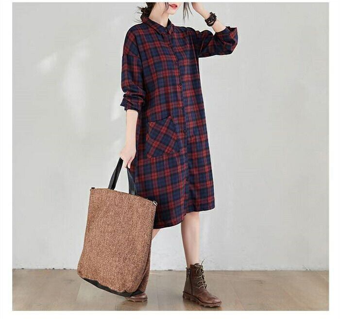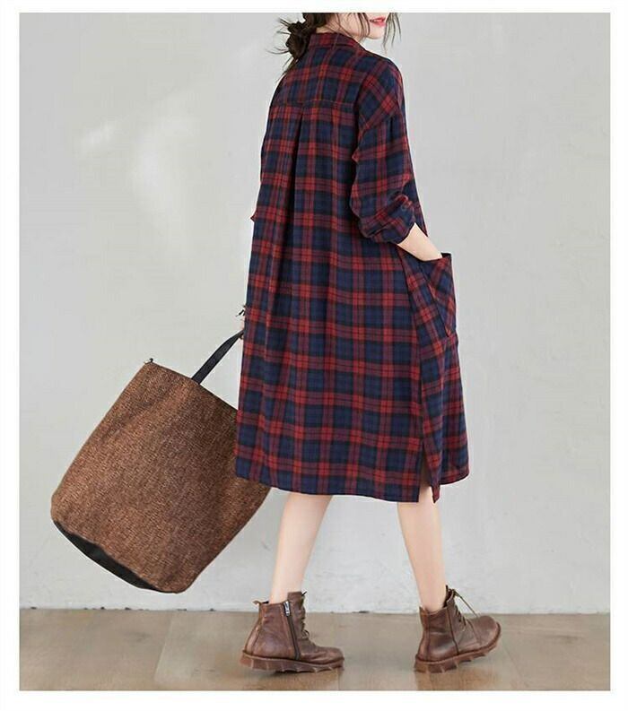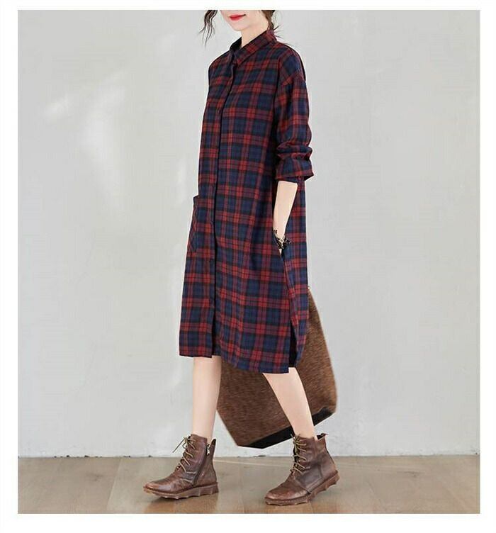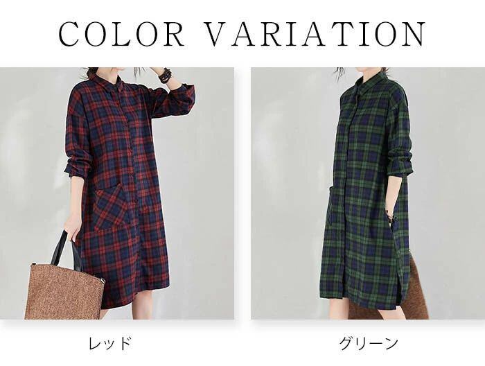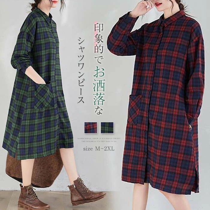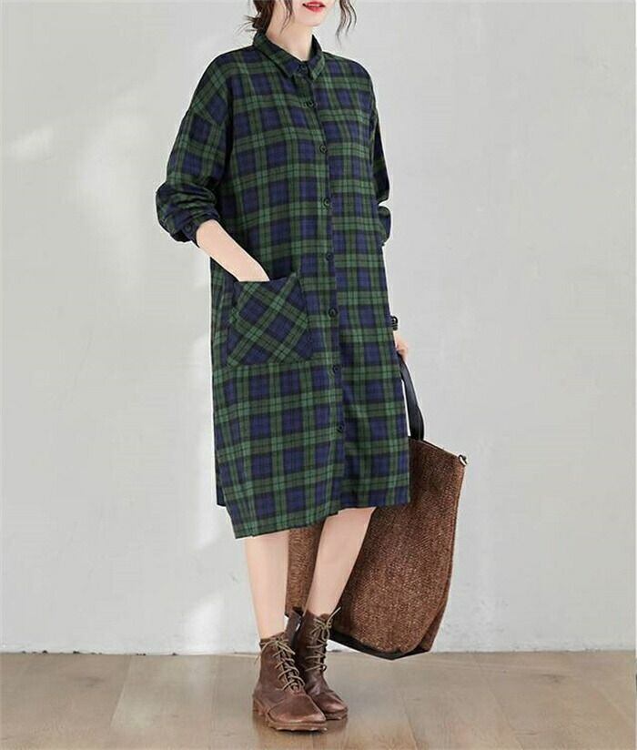シャツワンピース レディース 秋冬 長袖 綿 コットン チェック柄 チュニックワンピース シャツ ワンピース ロングワンピース ミモレ丈 ギン