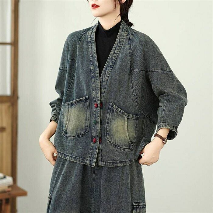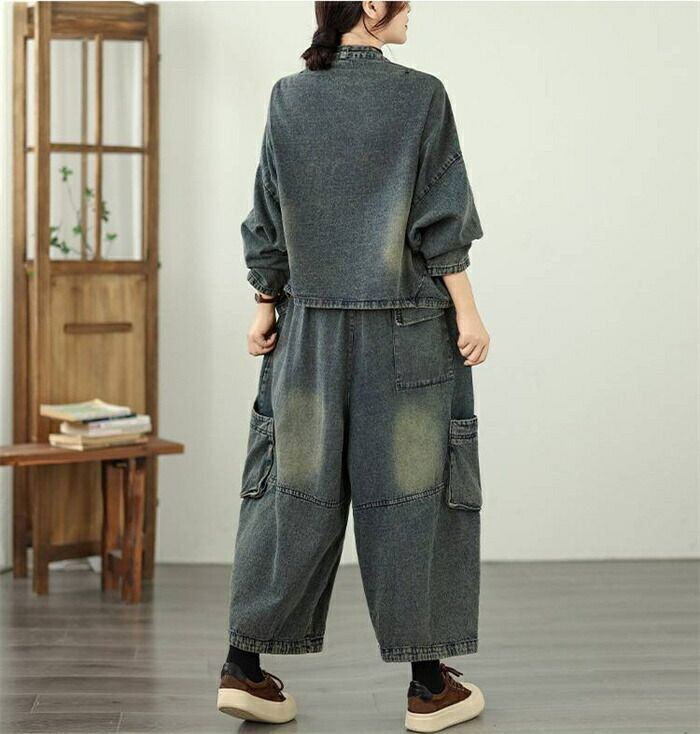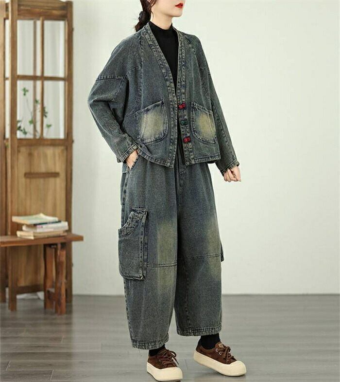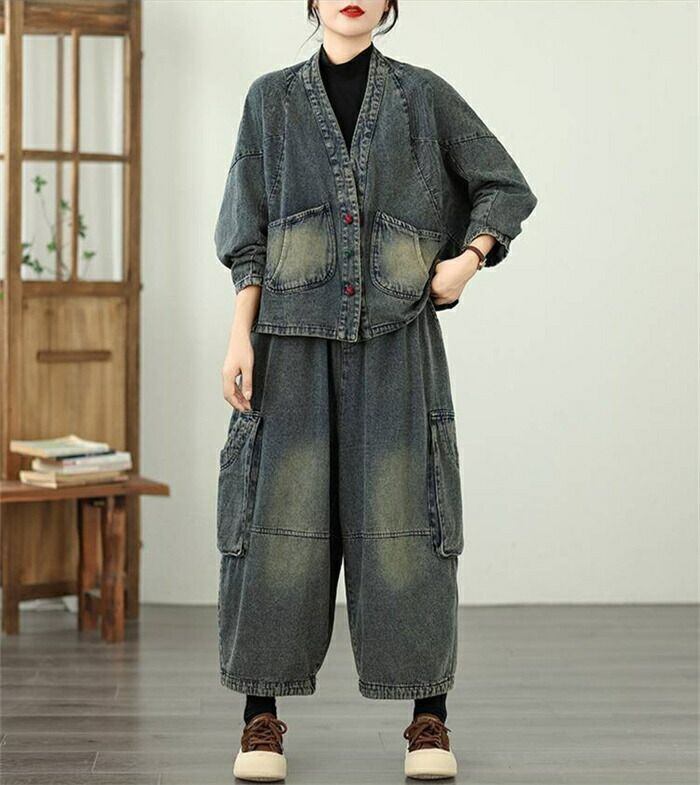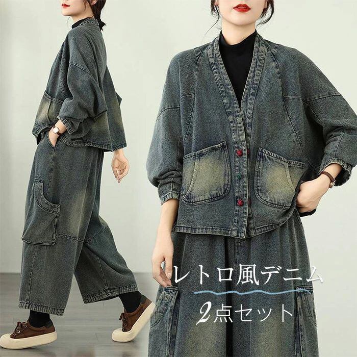 デニム 2点セット デニムセットアップ レディース 秋 パンツセット セットアップ カーディガン Vネック 長袖 カーデ デニムパンツ ワイド