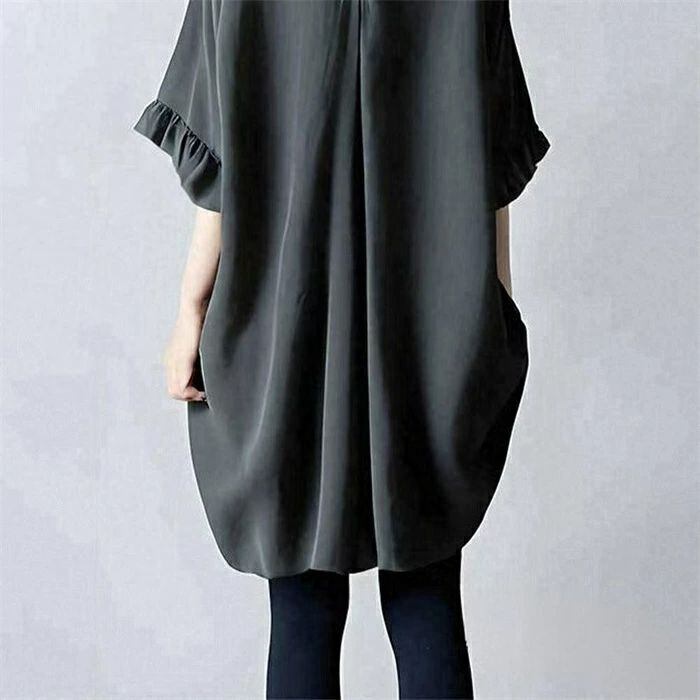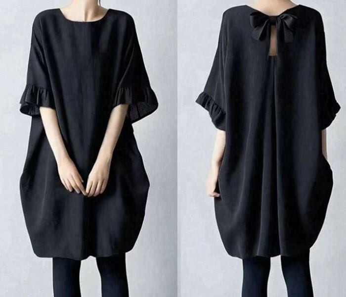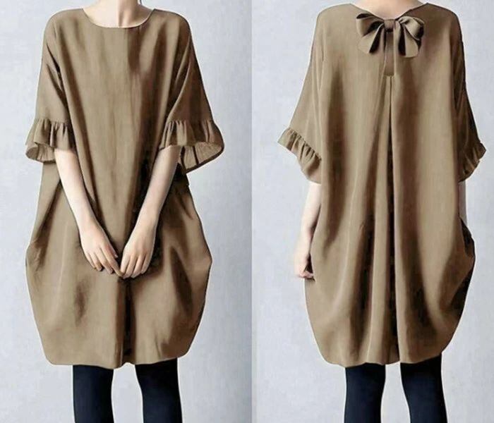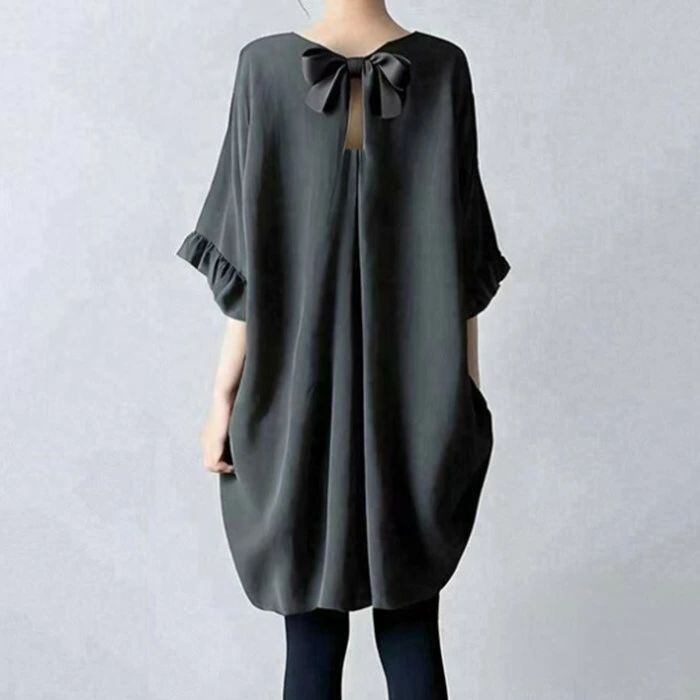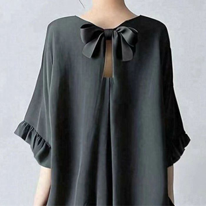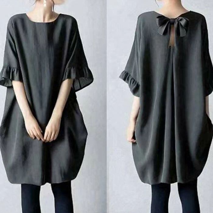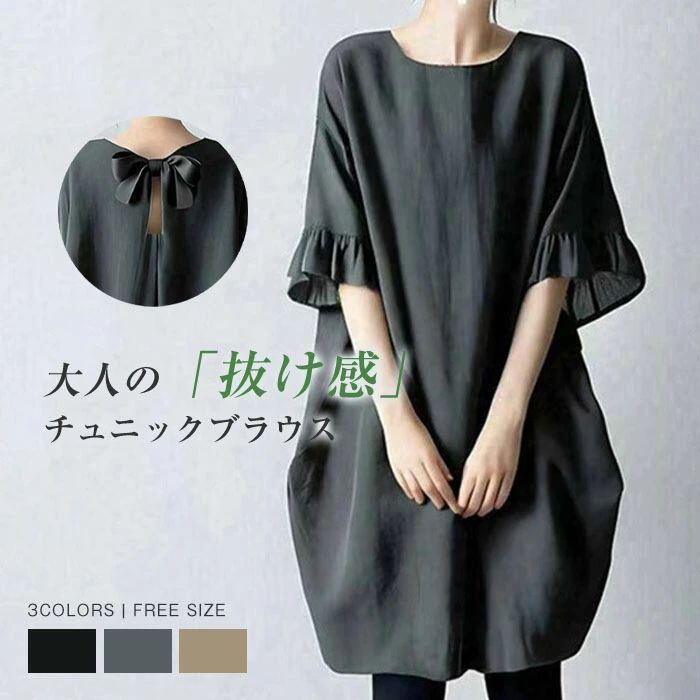 バックリボン チュニック ブラウス レディース フレア袖 シャツ 半袖 チュニック シャツ 夏 プルオーバー クルーネック ナチュラル トップス 森ガール オーバーサイズ ビック コクーン 体型カバー ビッグシルエット 大きいサイズ ゆったり エスニック カジュアル 無地 送料無料 カジュアル オフィス ナチュラル 定番 可愛い