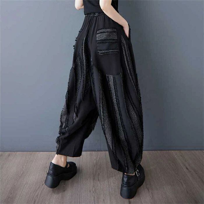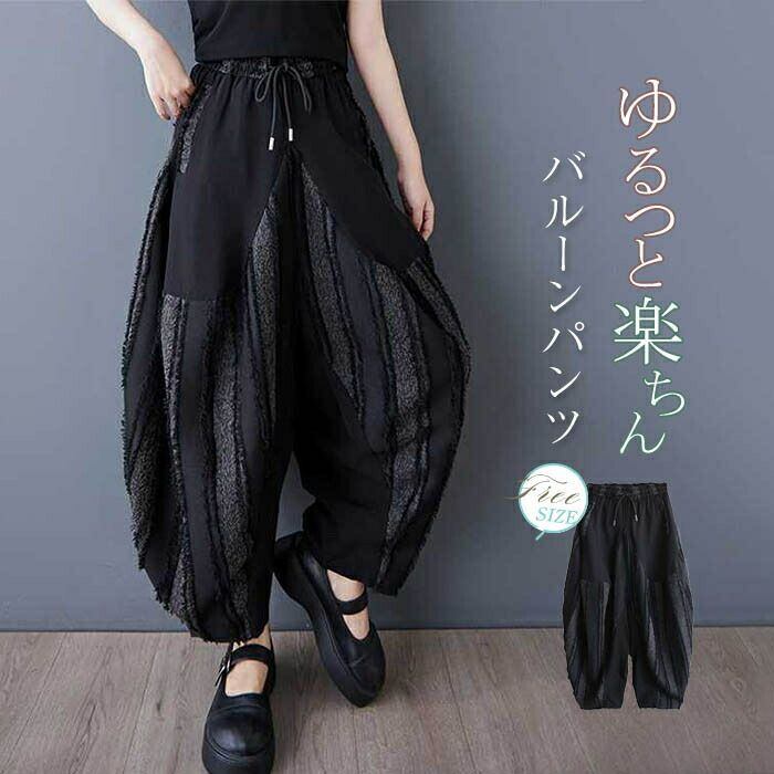 バルーンパンツ レディース 夏 ロング丈 ストライプ配色 切替パンツ サルエル ポケット付き ハイウエスト ボトムス 異素材切り替え ウエストゴム 大きいサイズ モード系 個性的 ゆったり 楽ちん 体型カバー 30代 40代 50代 おしゃれ ナチュラル 送料無料 おしゃれ ナチュラル 着やせ 美脚