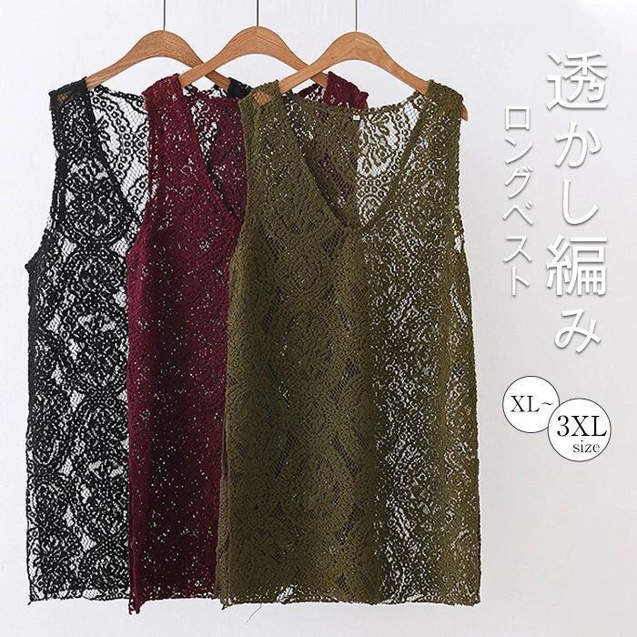 透かし編み ベスト タンクトップ レディース 春 夏 サマーベスト ロング丈 ロング ベスト シースルー トップス クロシェ編みベスト 大きい