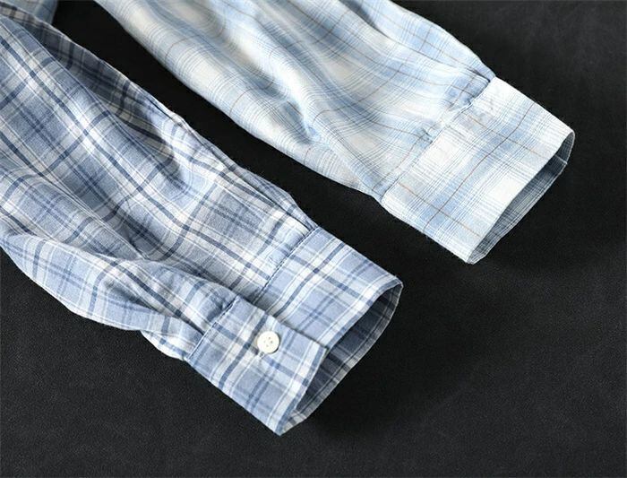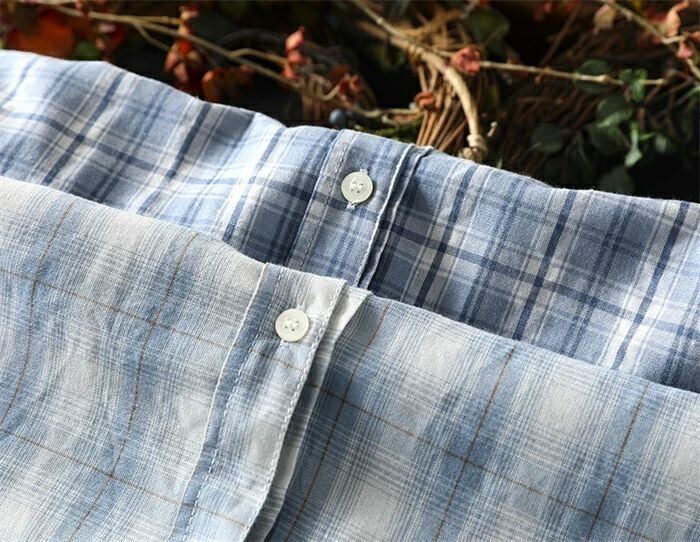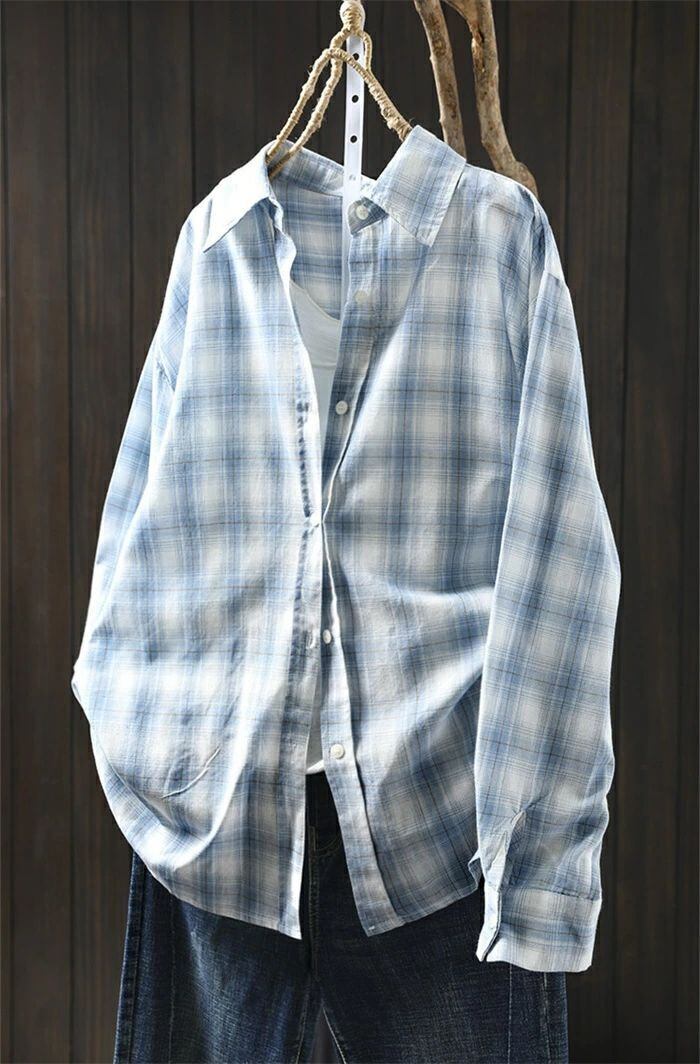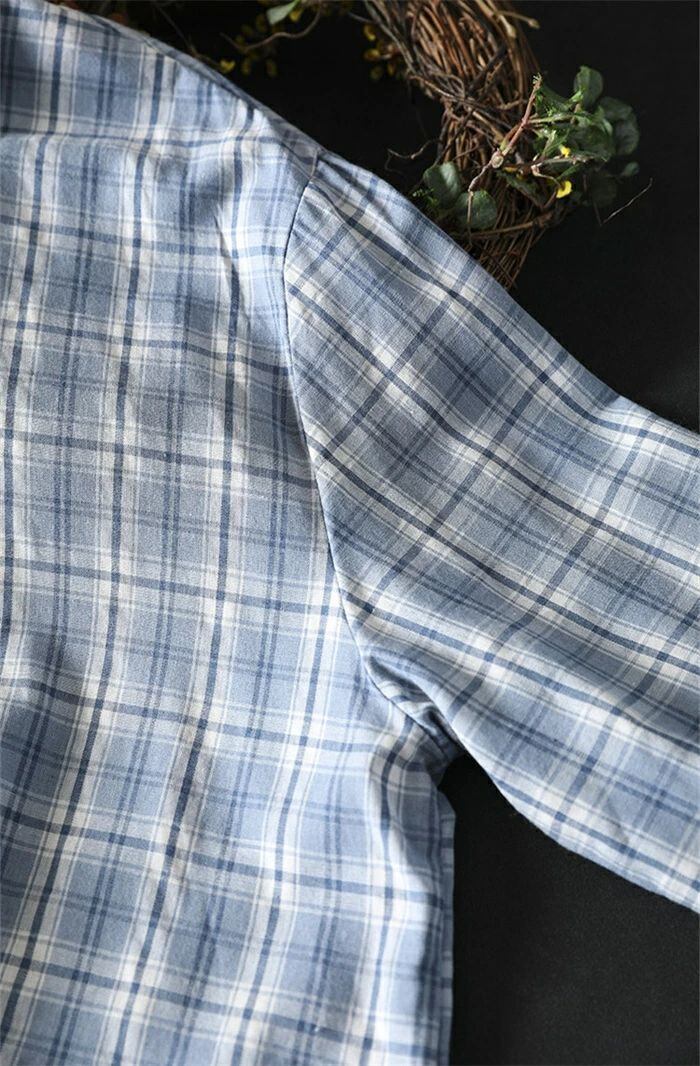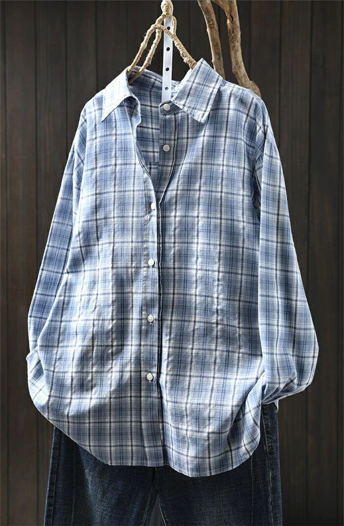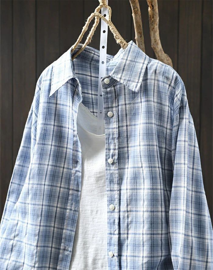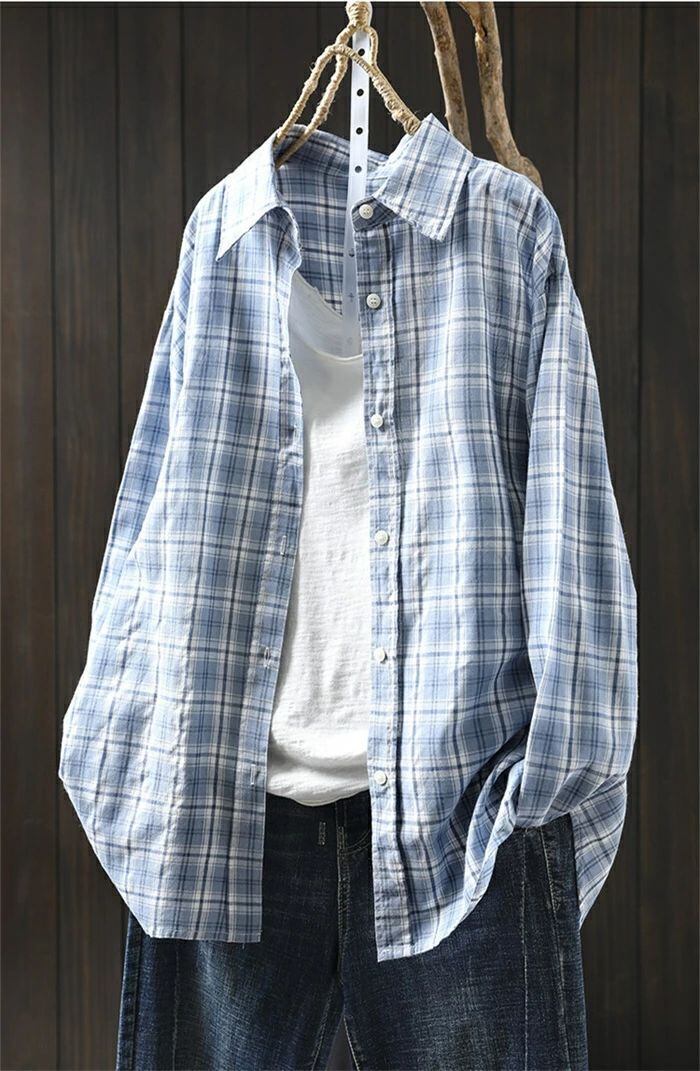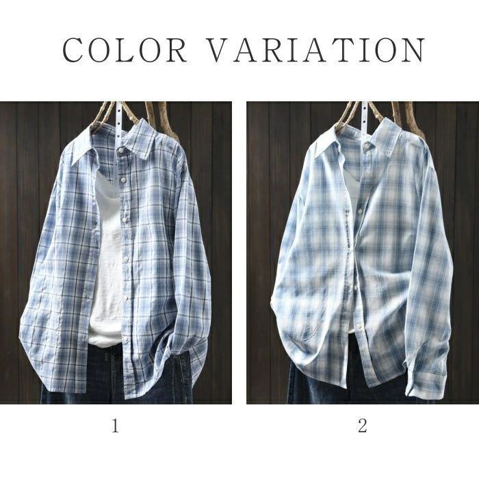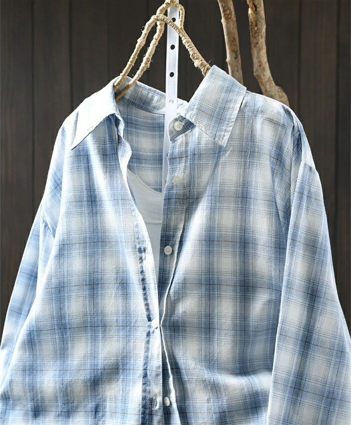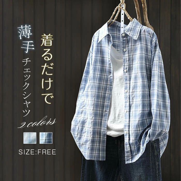 シャツ チェックシャツ レディース 春秋 シャツブラウス 薄手 長袖 チェック柄 ブルー 綿シャツ 綿 コットン 折襟 前開き 折襟 レイヤード 重ね着 可愛い ゆったり 体型カバー 着?せ 森ガール カジュアル シンプル オフィス 通勤OL 通学 20代 30代 40代