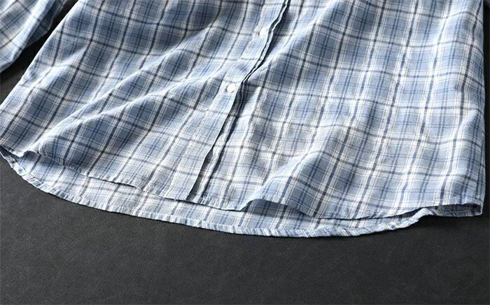 シャツ チェックシャツ レディース 春秋 シャツブラウス 薄手 長袖 チェック柄 ブルー 綿シャツ 綿 コットン 折襟 前開き 折襟 レイヤード