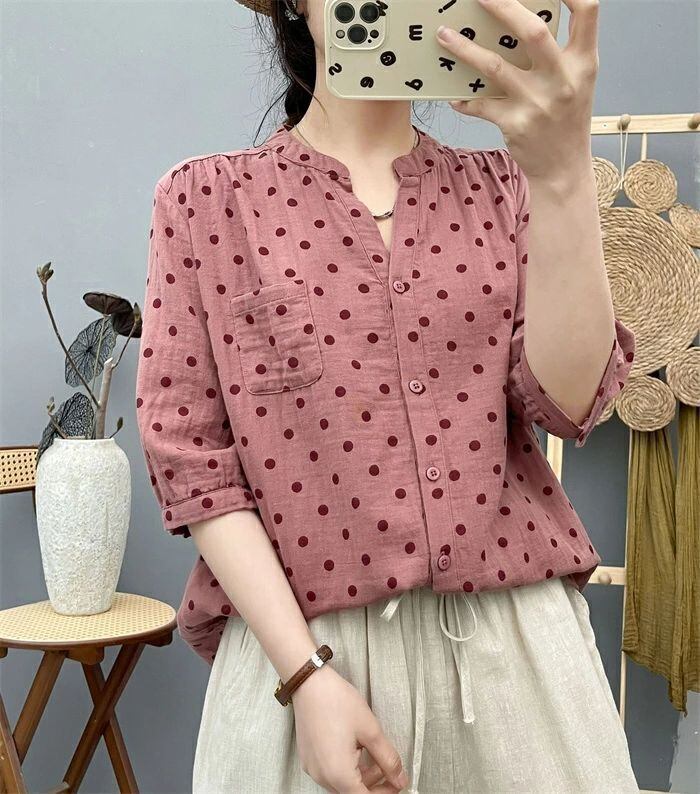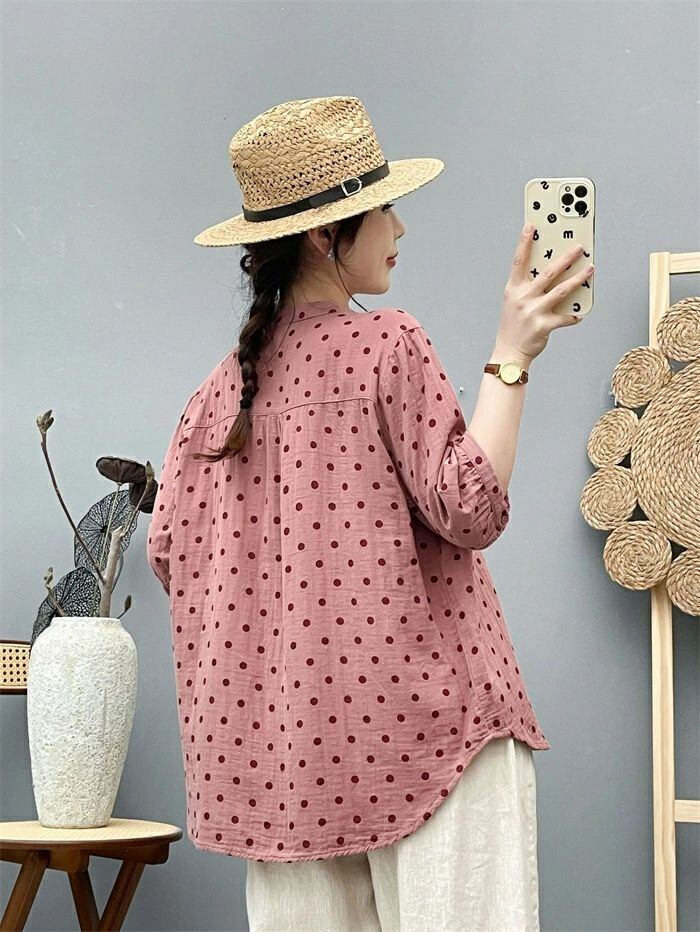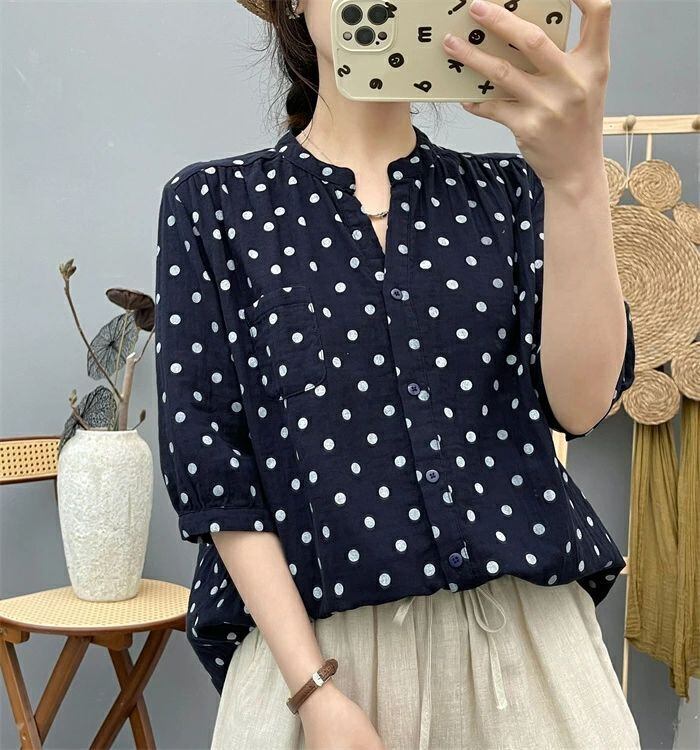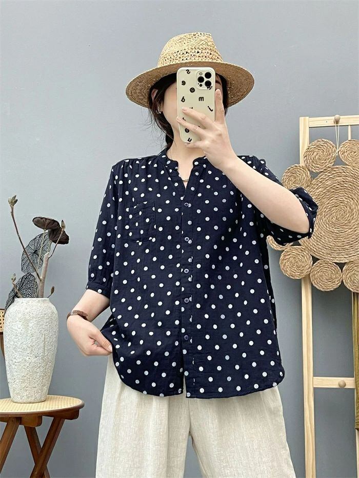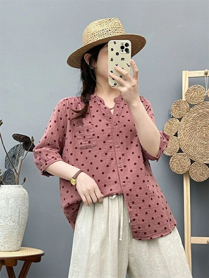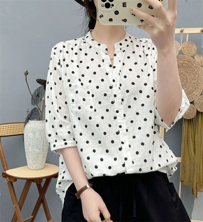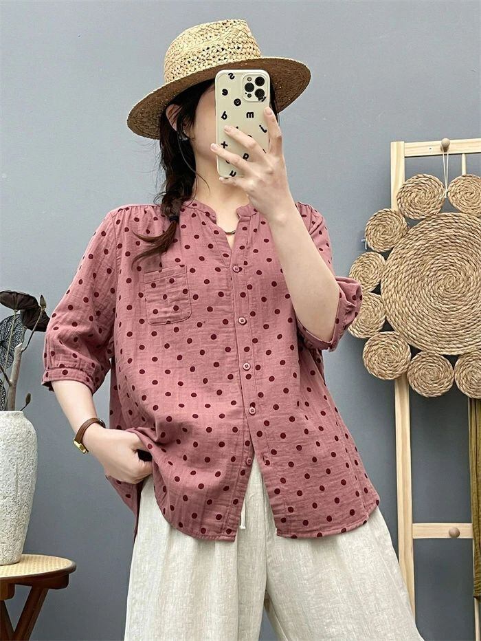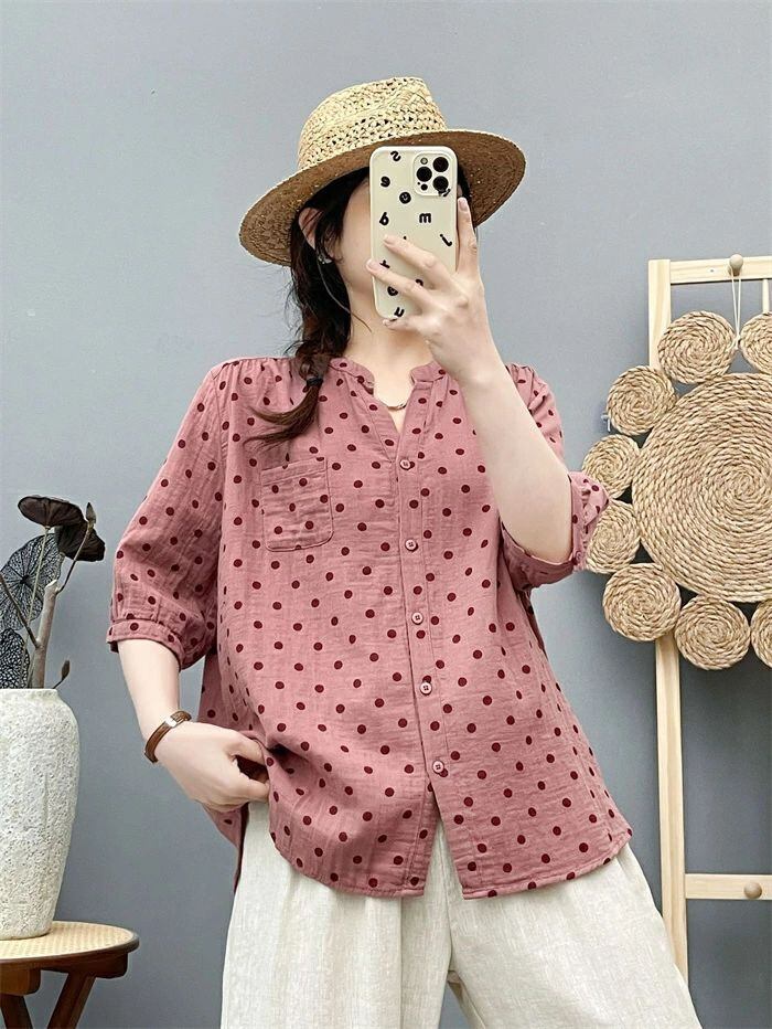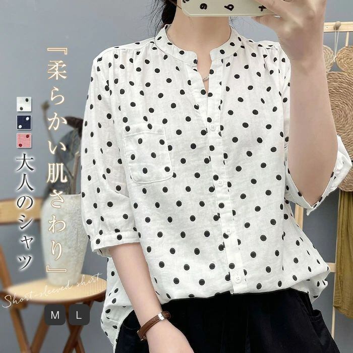 ガーゼ シャツ ブラウス 半袖 コットン シャツ ブラウス レディース 半袖 五分袖 綿 シャツブラウス Vネック シャツ ドット 水玉柄 トップス 前開き シンプル ナチュラル 大きいサイズ ゆったり 通勤 通学 カジュアル キレイめ 大人 可愛い 送料無料 シンプル 襟付き 折襟 大人 可愛い 綿100% 白 30代 40代 50代 送料無料 定番 可愛い