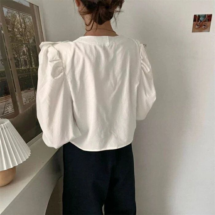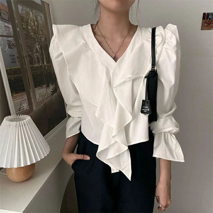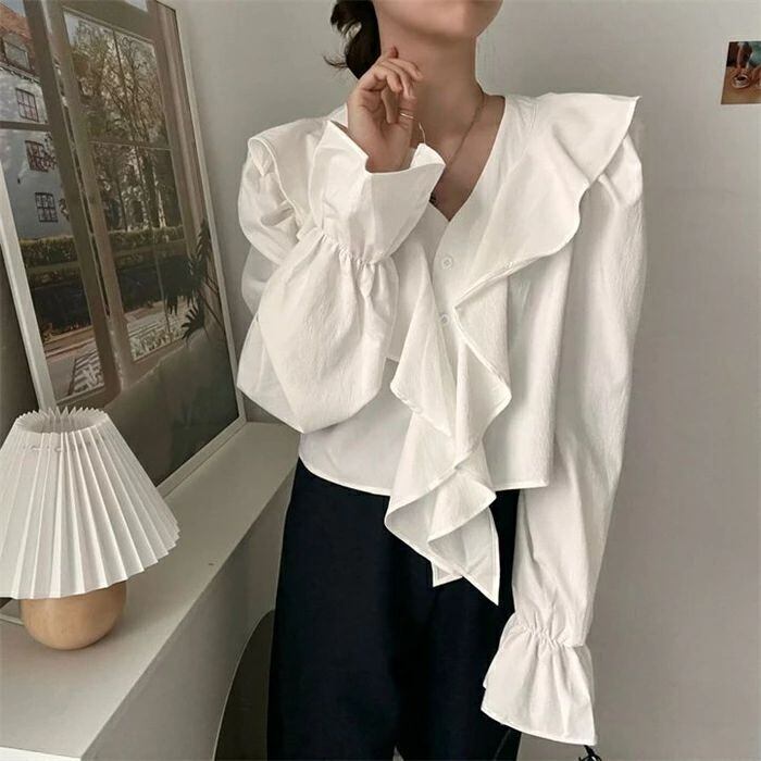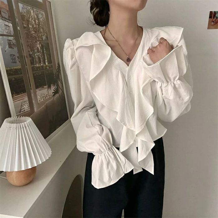 フリルブラウス シャツ ブラウス レディース 春 秋 トップス Vネック 長袖 前開き 胸元フリル パフスリーブ ショート丈 無地 きれいめ 無地