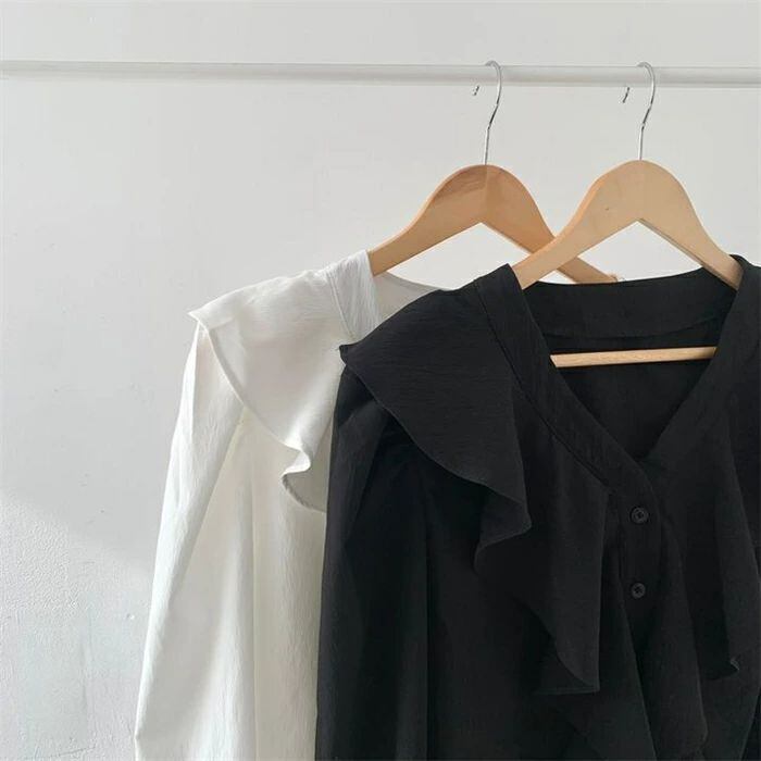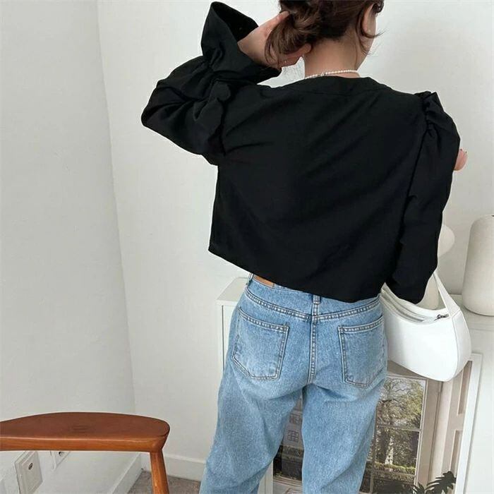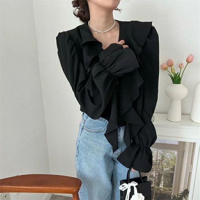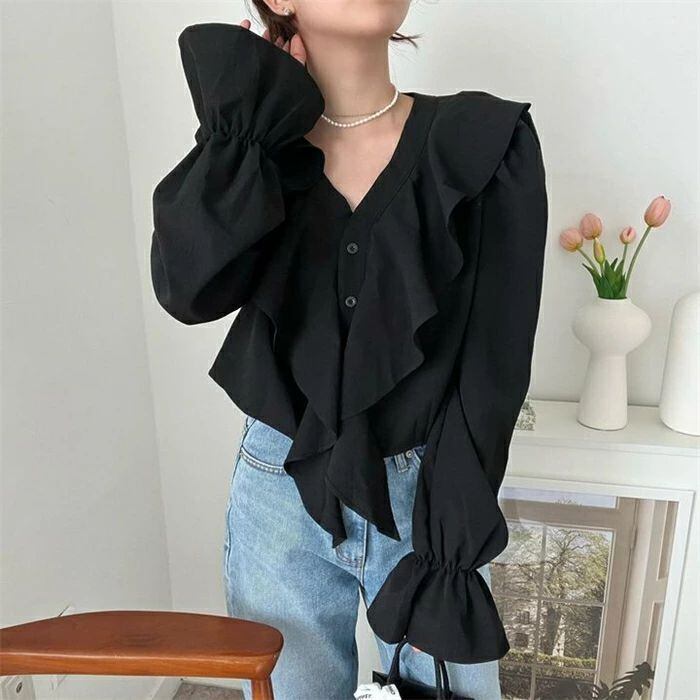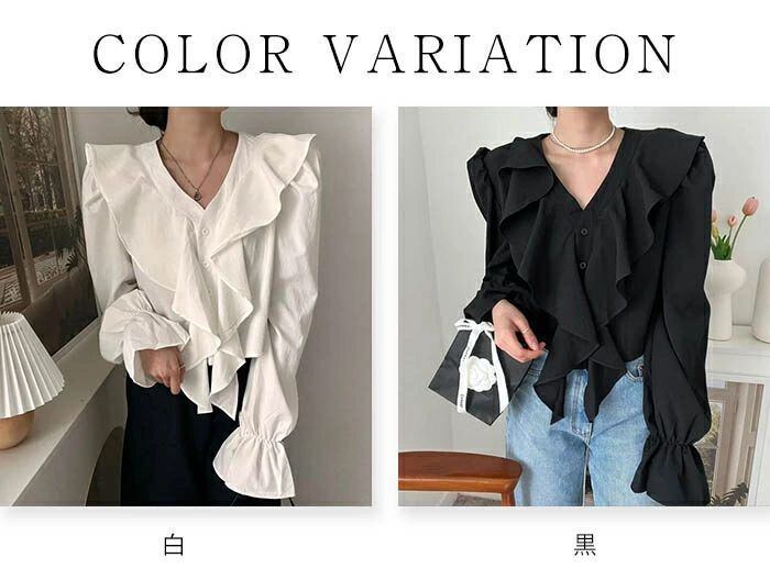 フリルブラウス シャツ ブラウス レディース 春 秋 トップス Vネック 長袖 前開き 胸元フリル パフスリーブ ショート丈 無地 きれいめ 無地 シャツブラウス オケージョン きれいめ オフィス カジュアル ブラック ホワイト 華奢魅せ 上品 30代 40代 50代 送料無料 きれいめ オフィス カジュアル ブラック ホワイト 春新作 送料無料