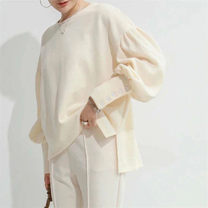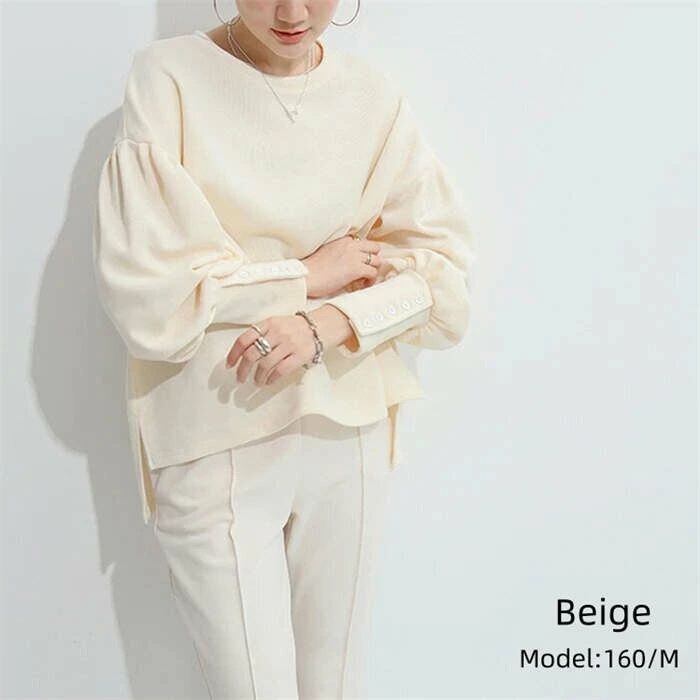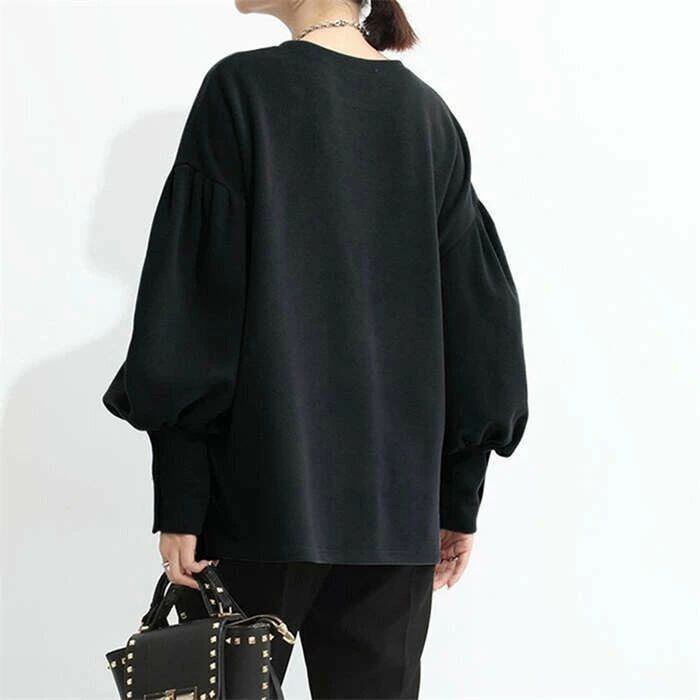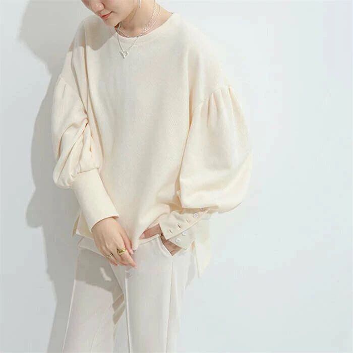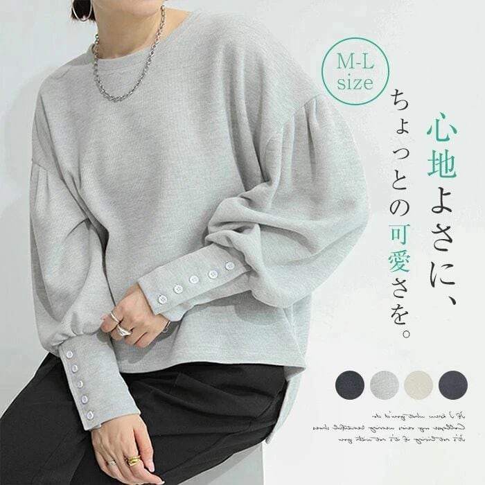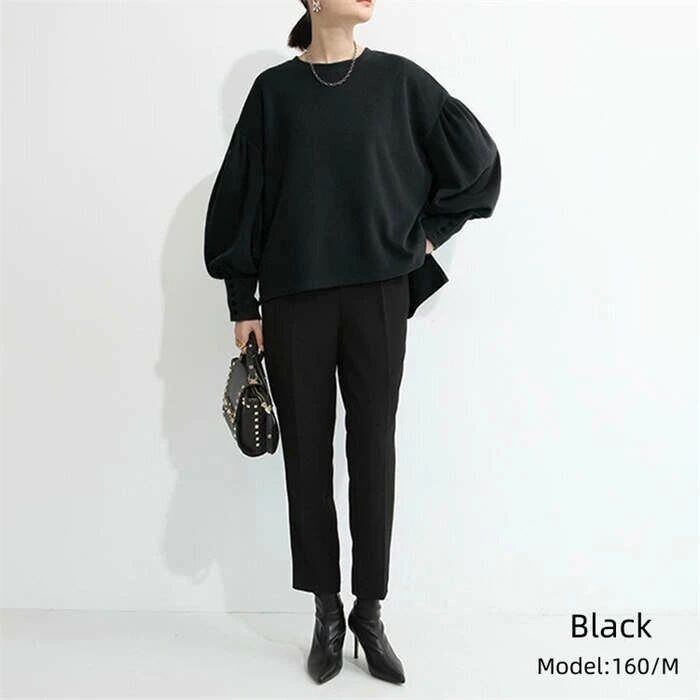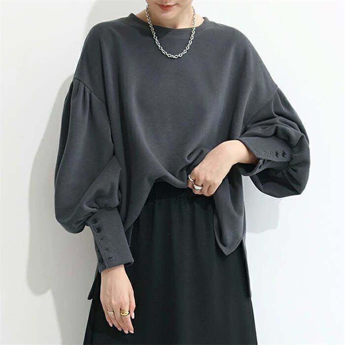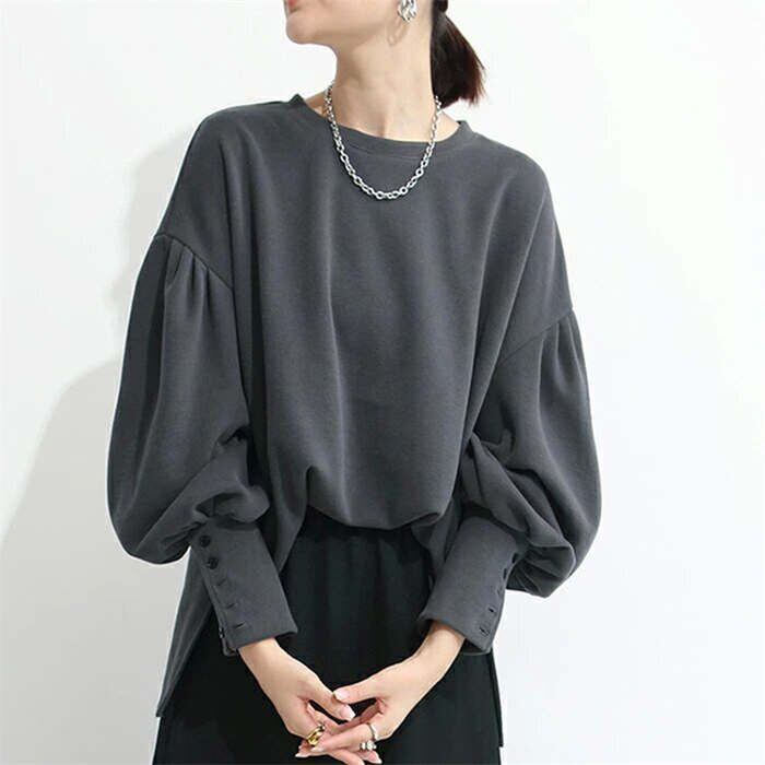 tシャツ トレーナー レディース トップス 長袖 きれいめ ボリューム袖 プルオーバー カットソー ビッグ ゆる ぽわん袖 バルーン袖 チュニック丈 クルーネック ベーシック スリット入り ルーズ 大きいサイズ 綿 コットン ゆる感 秋 冬 春 こなれ感 大人 黒 灰色 カジュアル オフィス ナチュラル 定番 可愛い