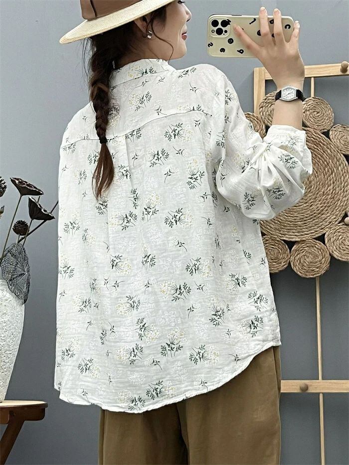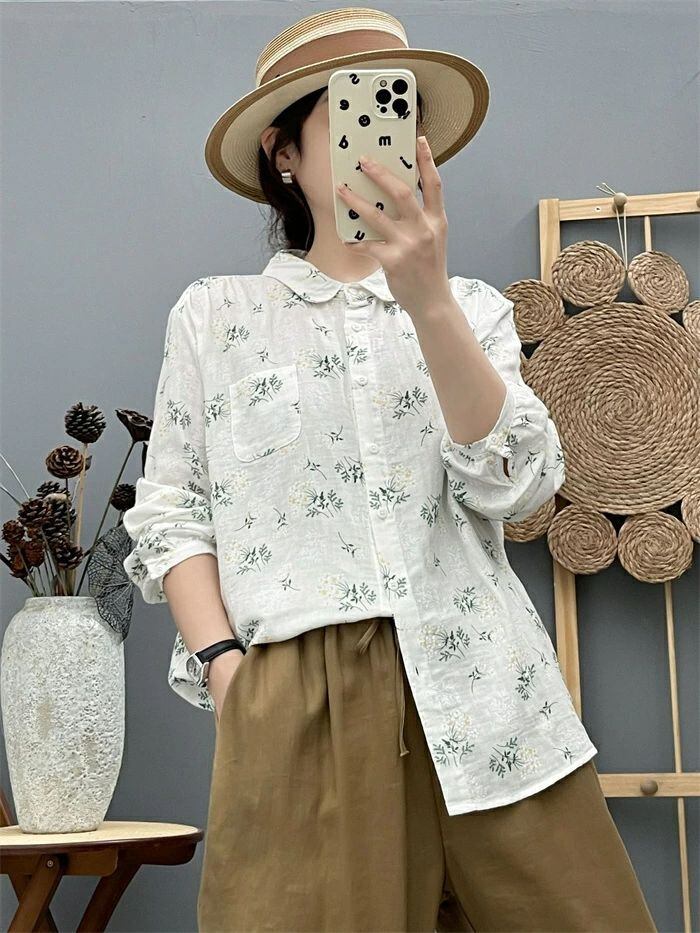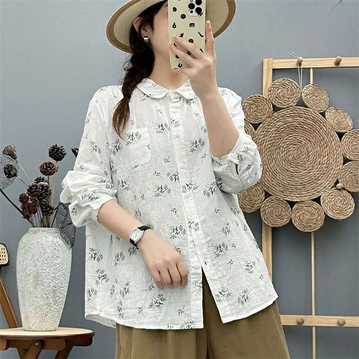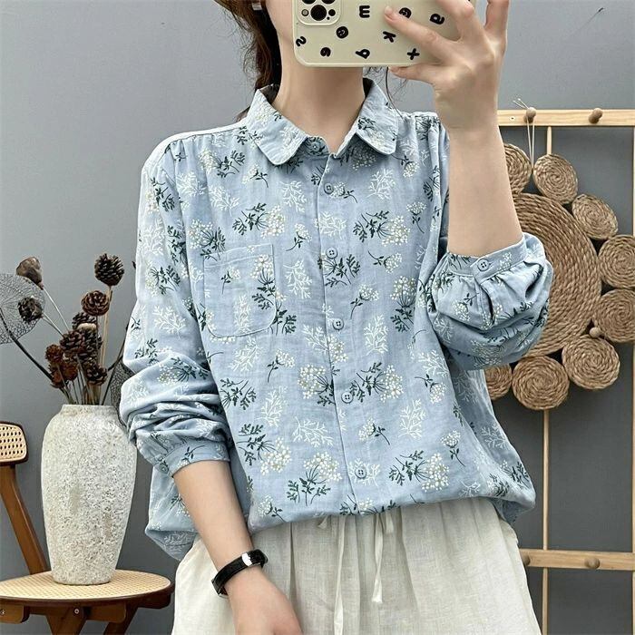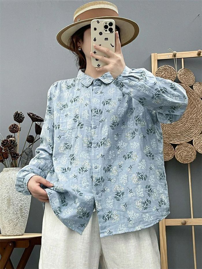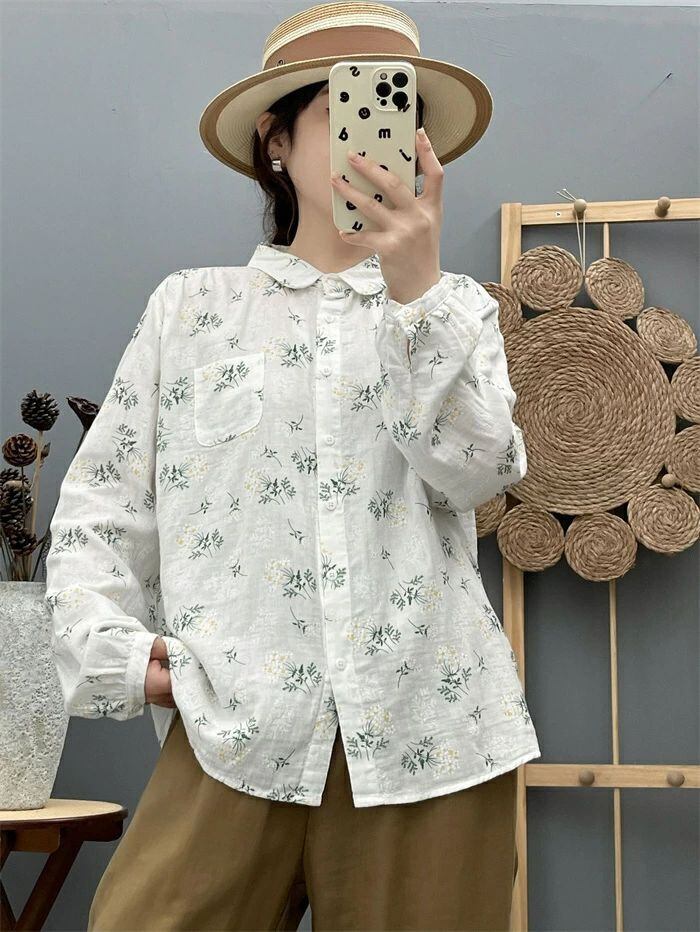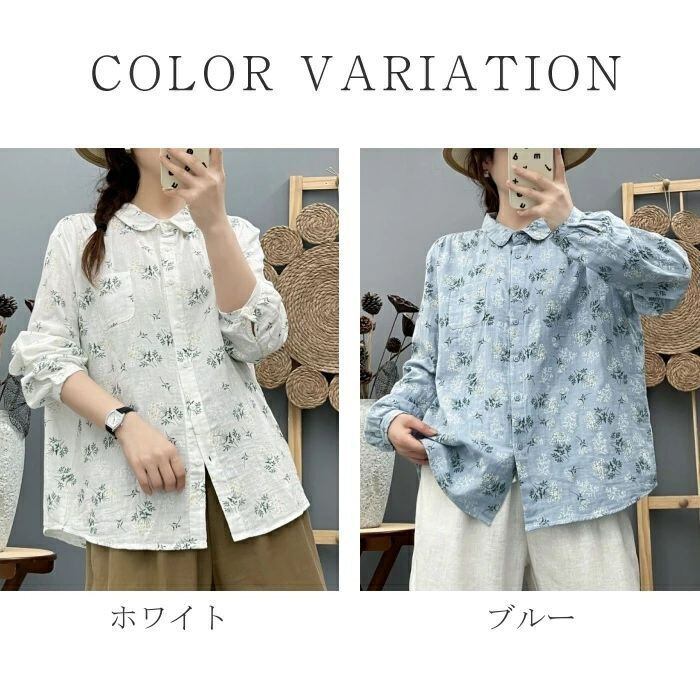 シャツ ガーゼシャツ レディース 春秋 綿シャツ 花柄 ガーゼ ブラウス 丸襟 長袖 ナチュラル 可愛い コットン 森ガール シャツブラウス ト