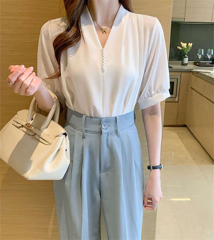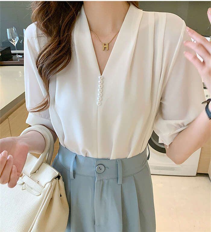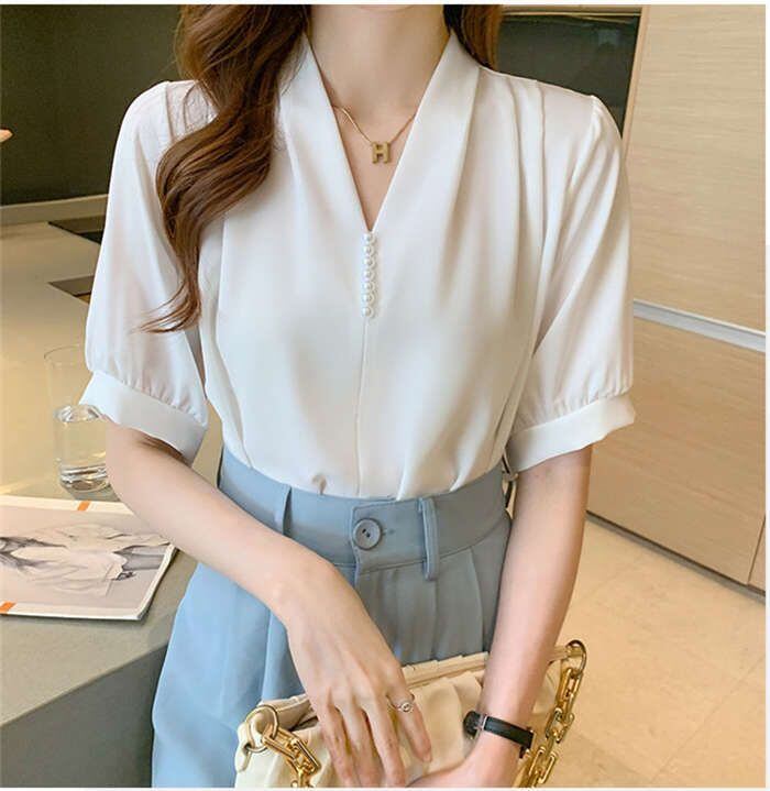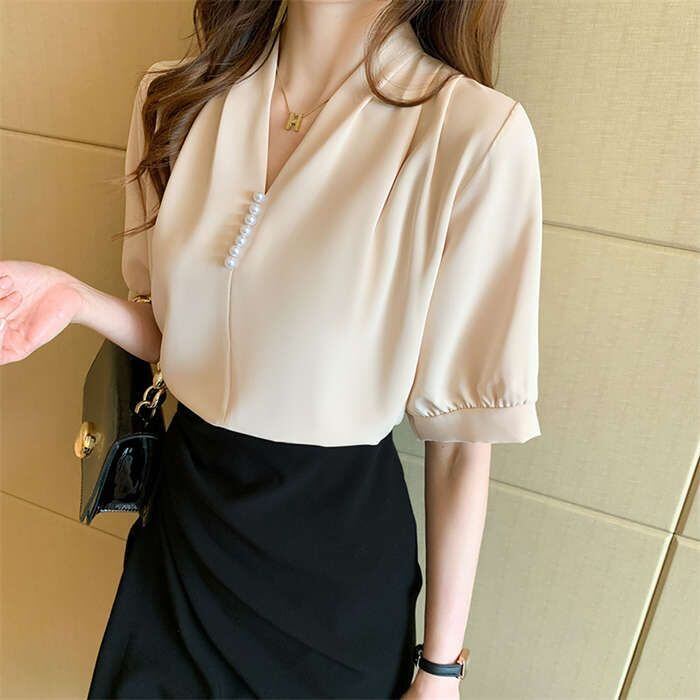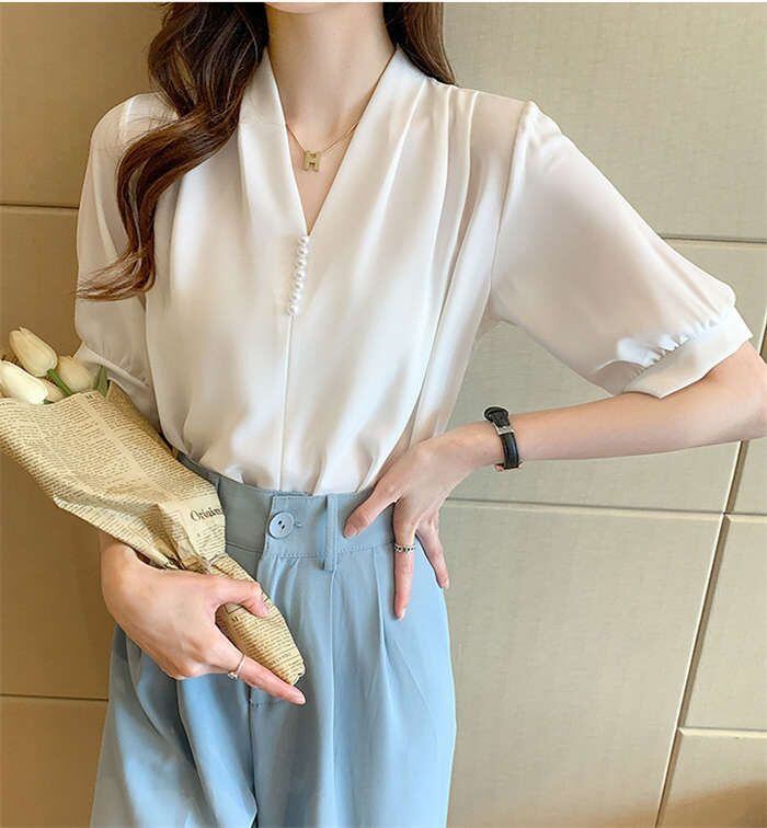 ブラウス レディース 半袖ブラウス 春夏 Vネック オフィスブラウス ソフォンブラウス オシャレブラウス シフォントップス 韓国風 大人 上品 通勤OL ゆったりシャツ 40代 50代 送料無料 上品トップス 大人 通勤OL ゆったり シャツ30代 上品 お洒落