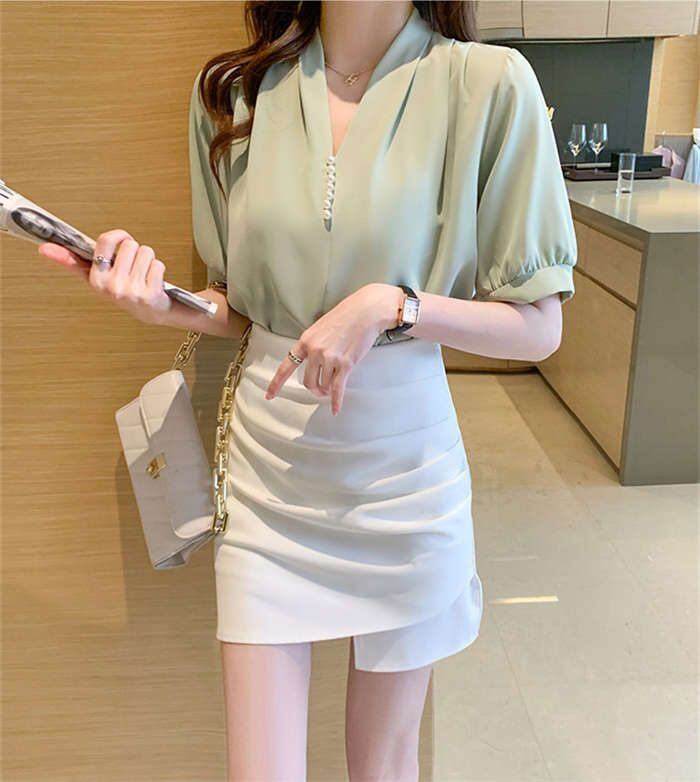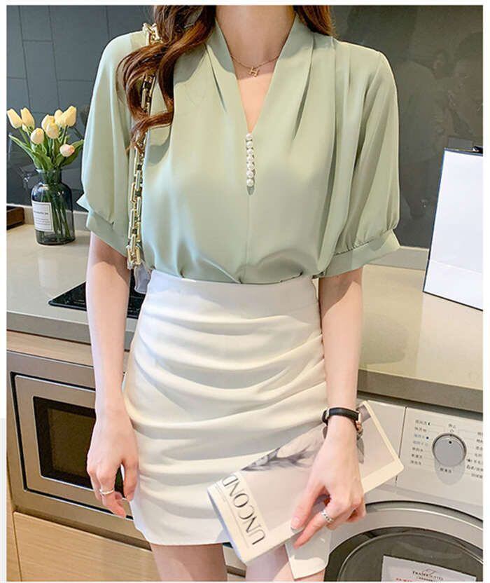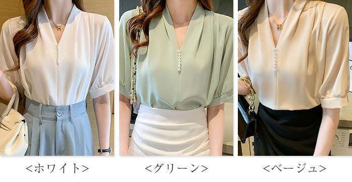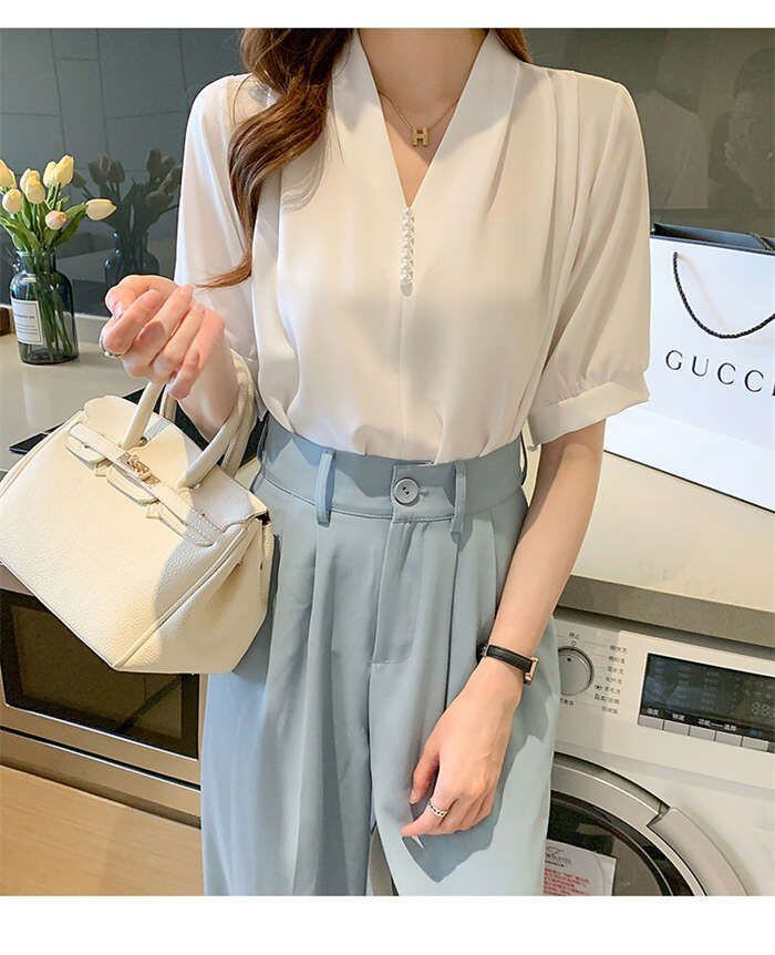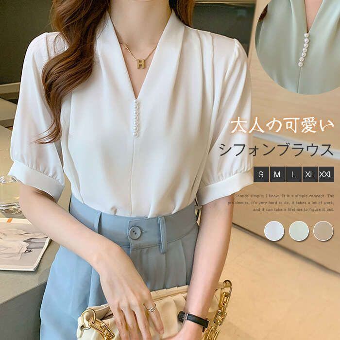 ブラウス レディース 半袖ブラウス 春夏 Vネック オフィスブラウス ソフォンブラウス オシャレブラウス シフォントップス 韓国風 大人 上品