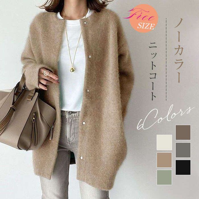 コート 秋冬 レディース ニット お尻隠れ アウター coat カーディガン ニットカーデ 上着 長袖 無地 ノーカラー カジュアル シンプル 暖か
