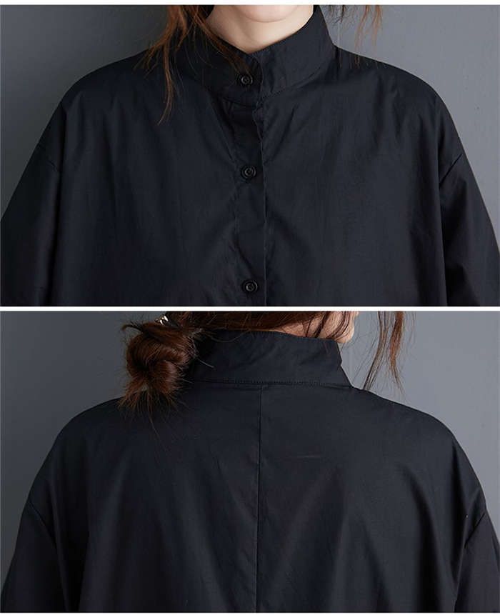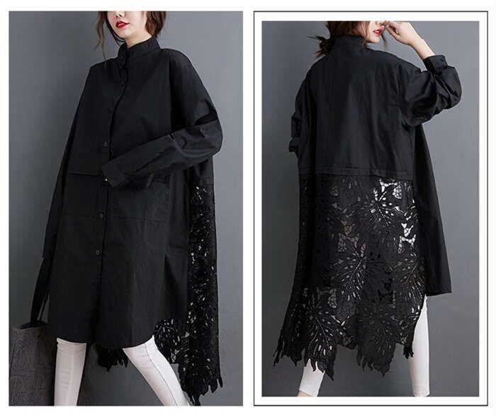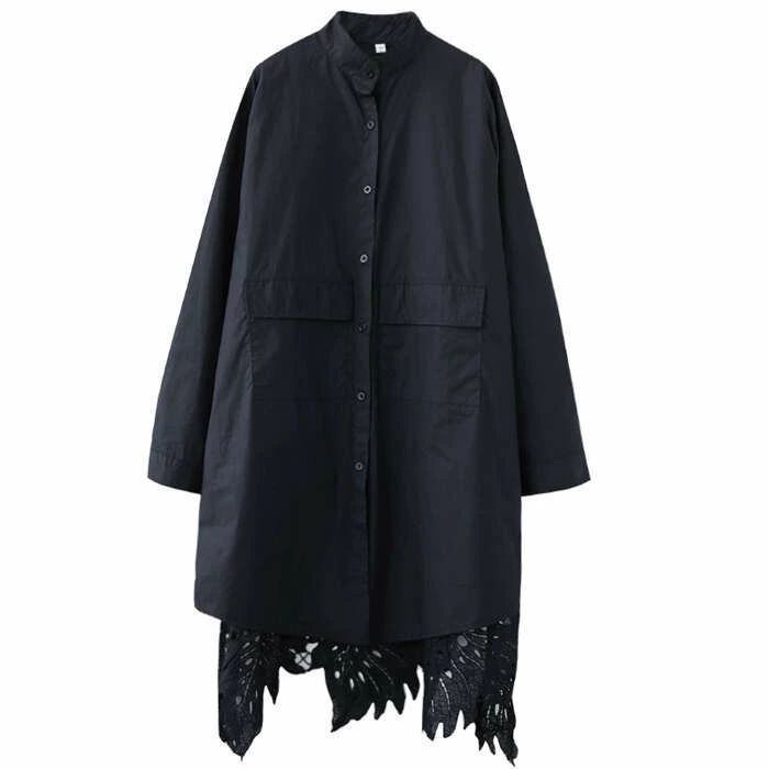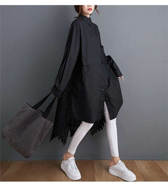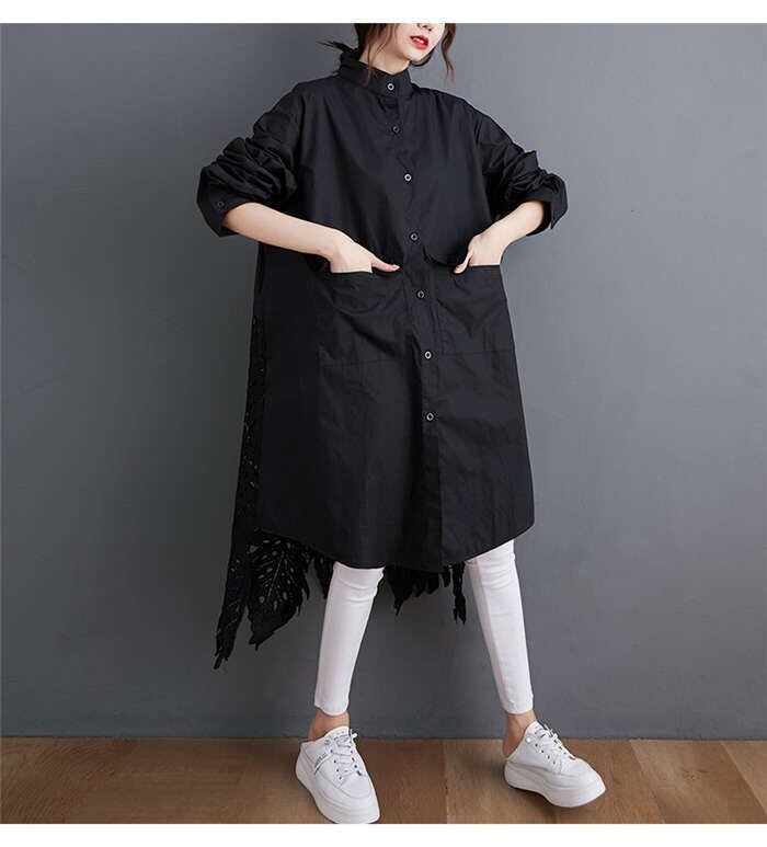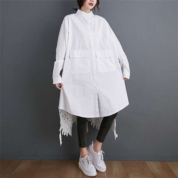 シャツワンピース レディース 秋 トップス ロングシャツ レース 立ち襟 ゆったり 長袖 チュニック プリント 体型カバー 不規則 大きいサイ
